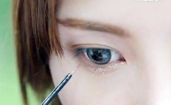 Nếu không thích phương pháp đeo lens, bạn có thể thử cách trang điểm hỗ trợ mắt to hơn này. Bắt nguồn từ Hàn Quốc, cách làm mắt to hơn bằng trang điểm thực ra rất đơn giản. Bạn chỉ cần có một cây bút sáp nhũ màu trắng hoặc lọ kem mắt nhũ trắng để viền mí dưới là đã có thể tạo hiệu ứng mắt to tròn long lanh hơn khi chụp hình.