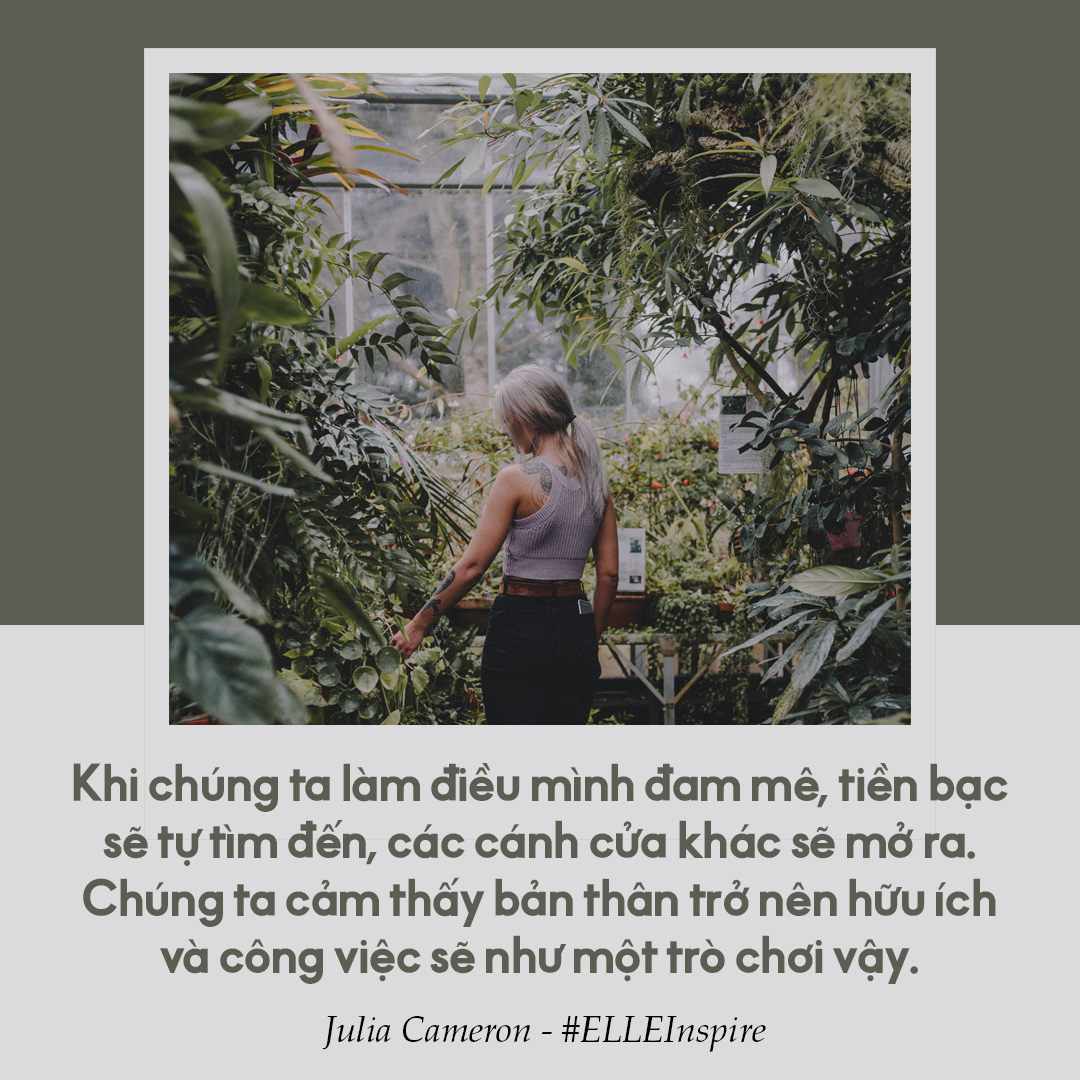“Khi chúng ta làm điều mình đam mê, tiền bạc sẽ tự tìm đến, các cánh cửa khác sẽ mở ra. Chúng ta cảm thấy bản thân trở nên hữu ích và công việc sẽ như một trò chơi vậy” – “When we do what we are meant to do, money comes to us, doors open for us, we feel useful, and the work we do feels like play to us” – Julia Cameron.