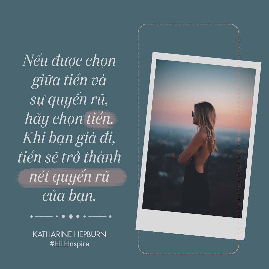 “Nếu được chọn giữa tiền và sự quyến rũ, hãy chọn tiền. Khi bạn già đi, tiền sẽ trở thành nét quyến rũ của bạn” – “If you’re given a choice between money and sex appeal, take the money. As you get older, the money will become your sex appeal” – Katharine Hepburn.