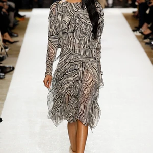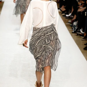 Thật vậy, bộ sưu tập không vắng bóng những thiết kế chiffon mềm mại tạo nét nữ tính nhẹ nhàng với hoa văn lạ đủ màu hoặc hình đường vân thân cây, hay đơn giản với họa tiết trắng đen. Yếu tố bí ẩn và hoang dại chủ đạo dường như nổi bật hơn với chất liệu giả da được ứng dụng trong các mẫu quần short, quần ống rộng và áo khoác to quấn kín người.