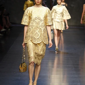 Hai nhà thiết kế sử dụng đa dạng các chất liệu ren, vải thêu kim tuyến, vải kim tuyến đục lỗ, chiffon, vải len alpaca từ lông lạc đà và da phủ sơn ánh vàng với bảng màu trải dài từ tông màu nhạt, kem, ánh vàng, xanh lá đậm đến đỏ, đen.