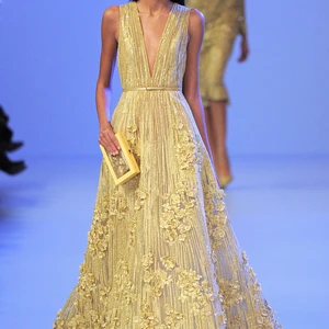 Bước ra khỏi vùng an toàn vốn có là màu đơn sắc, năm nay Saab đã đặc cách thêm vào bảng màu thiết kế của mình những nhân tố màu mới, xuất hiện trên các mẫu váy đầm dài. Màu tím cà ombre, vàng chanh, xanh cẩm tú cầu và hồng san hô – tất cả vẽ lên một không gian tràn đầy nhựa sống như trong các bức họa nổi tiếng của Lawrence Alma-Tadema.