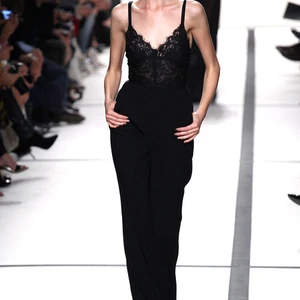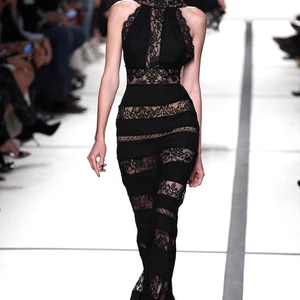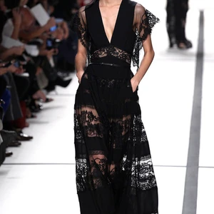 Tuy không chiếm đa số trong bộ sưu tập, những chiếc đầm ren đen huyền bí ở cuối buổi trình diễn lại khiến người xem mãn nhãn nhất. Mẫu đầm treo cổ để lộ phần vai và lưng tuyệt đẹp với các dải lụa và ren viền ngang xen kẽ nhau. Có thể nói, một bộ cánh đẹp quyến rũ là khi tất cả các phần đều kín đáo, chỉ trừ phần ren trong suốt nơi cánh tay làm lộ làn da trần gợi cảm.