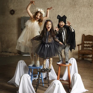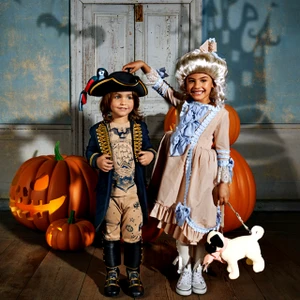 Đi kèm áo váy và những bộ vest là hàng loạt phụ kiện như tóc giả, vương miện công chúa, bốt cướp biển, mặt nạ,… để các bé hoàn thành “vai diễn” ngày Halloween.