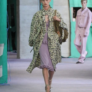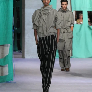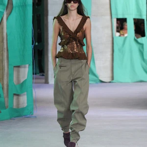 Daniel Lee còn gây ấn tượng với việc thử nghiệm các kiểu cắt vải sáng tạo, như quần capri cạp trễ với đường xẻ cao đến đùi kết hợp áo khoác biker siêu ngắn tạo nhiều chiều kích mới mẻ. Đặc biệt, phong cách “glam rock” trở lại mạnh mẽ với những chiếc váy dạ hội ôm sát phân tầng, lấp lánh từ những dải kim sa, được che chắn bằng áo khoác ngoài cứng cáp.