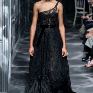 Ngoại trừ thiết kế đầu tiên, chiếc áo thun biến tấu theo phong cách Hy Lạp cùng dòng chữ “Are Clothes modern?”, bộ sưu tập Dior Haute Couture 2019 tràn ngập sắc thái đen huyền bí. Vẫn thừa hưởng những di sản thiết kế của Christian Dior, Maria thỏa sức sáng tạo trong màu đen, với thiết kế áo dạ đứng dáng, bộ suit hiện đại hay đầm dự tiệc phá cách. Chất liệu, chi tiết bề mặt như lông vũ, hay quần tất lưới kiến tạo cá tính thời trang trong màu đen trung tính.
