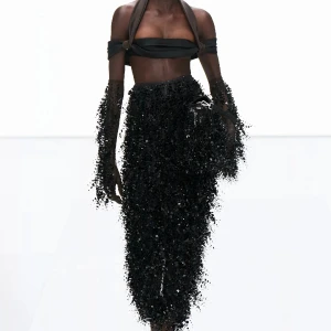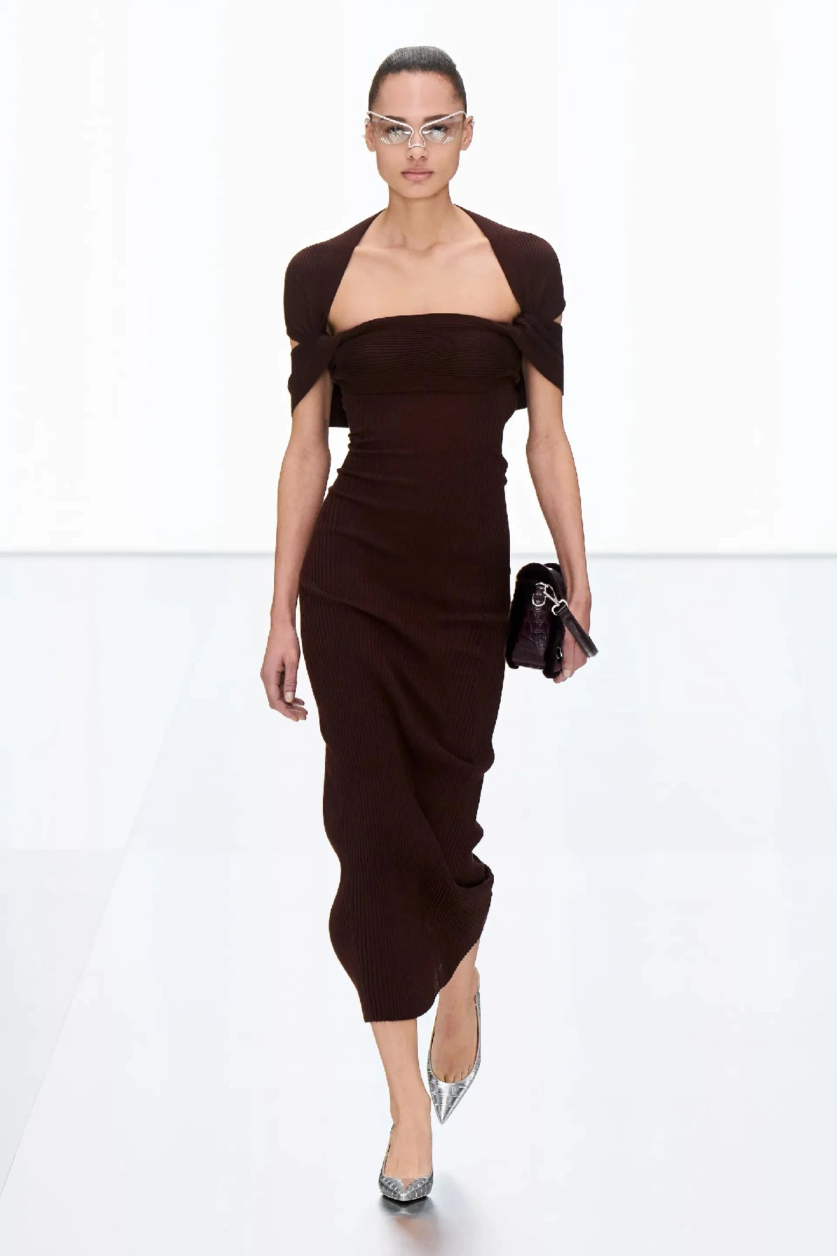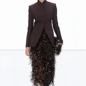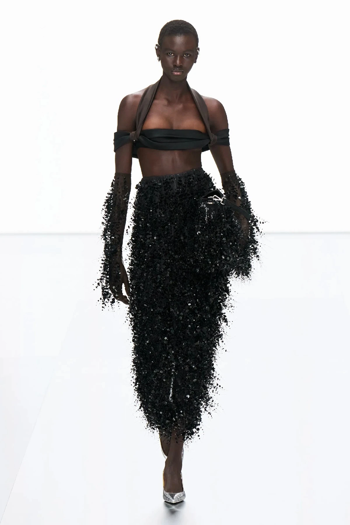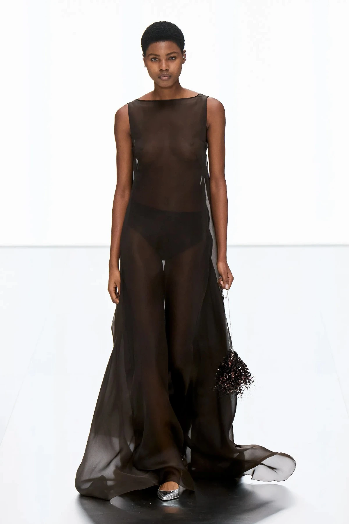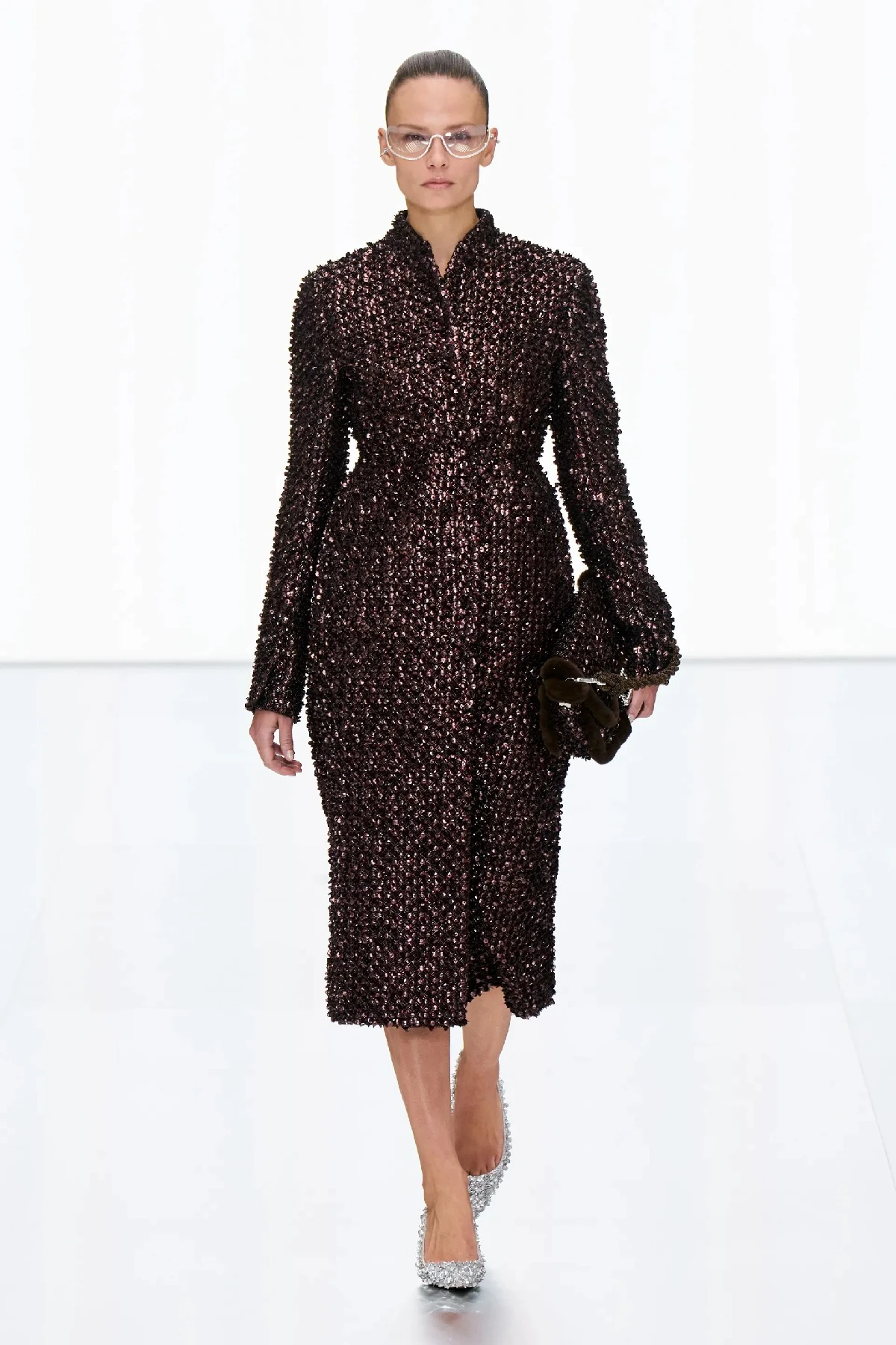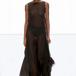 Khi người mẫu bước xuống sàn diễn, ta nhanh chóng nhận ra rằng bộ sưu tập này là một nghiên cứu về sự tương phản. Những chiếc váy màu đen trơn và xuyên thấu, những chiếc váy cứng cáp đính kết cườm tỉ mỉ, sáng bóng và lấp lánh. Với mỗi kiểu dáng tối giản hay tối đa đều được chọn lựa những phụ kiện phù hợp: chiếc túi cỡ lớn, một số được nhấn nhá bằng viền bạc hoặc những mẫu túi micro trong lòng bàn tay.