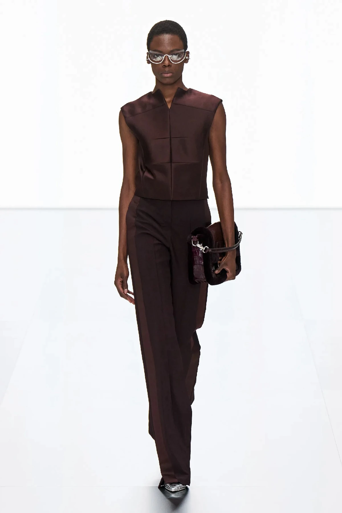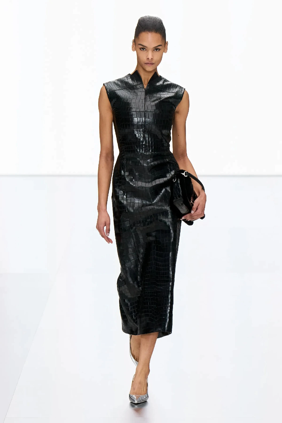 Bộ sưu tập mở đầu với một loạt các kiểu dáng đơn giản, được thiết kế với màu sắc tối giản, chủ yếu là màu đen. Áo cổ lọ hở lưng với chân váy ôm sát, váy maxi mỏng, áo vest không tay phối với quần tây. Sau đó, BST chuyển sang những bộ cánh công phu hơn, tạo nên một loạt kiểu dáng với kim loại màu bạc ấn tượng. Chủ đề vẫn nhất quán: tránh sự phô trương và tập trung vào tính thủ công và thực tế.