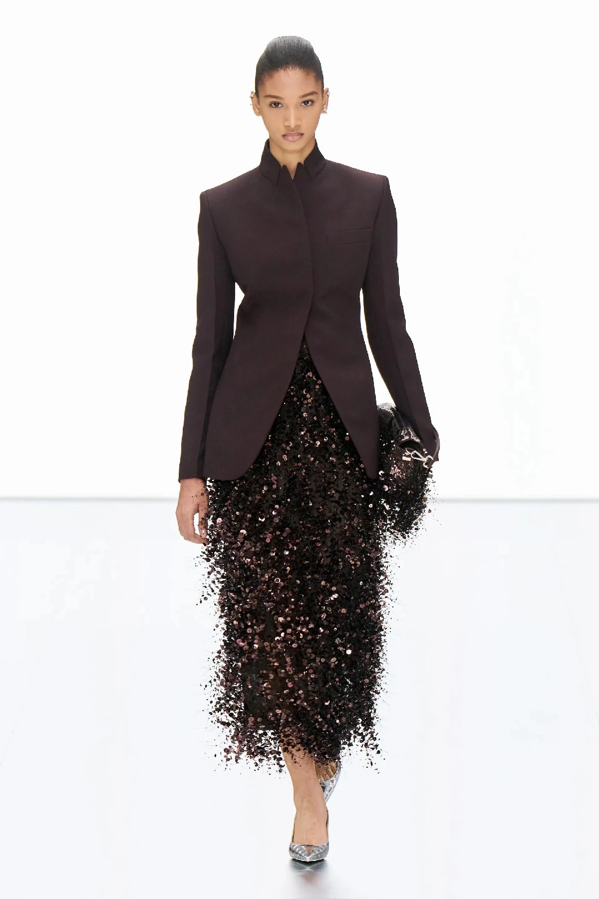 Một ví dụ điển hình về nghề thủ công này được thể hiện rõ ràng trong bộ vest màu hồng nhạt, những hạt sequins lấp lánh rơi xuống như những cánh hoa trong gió. Thiết kế tô đậm sự hài hòa về kết cấu, kết hợp sự mềm mại với cấu trúc, một biểu tượng tiêu biểu cho tầm nhìn của Kim Jones.