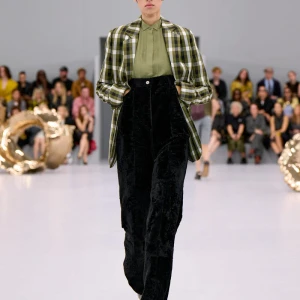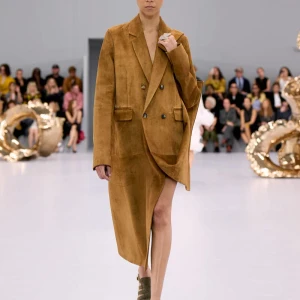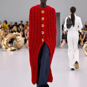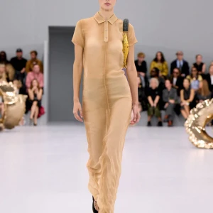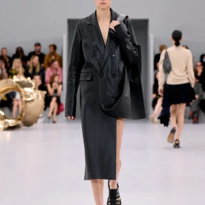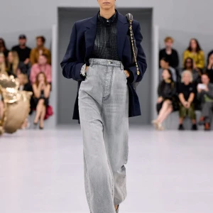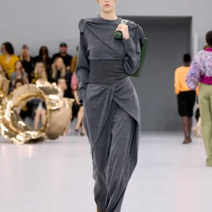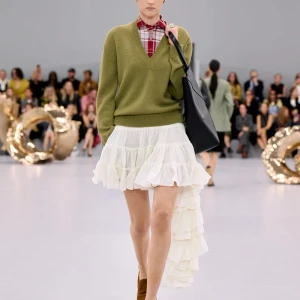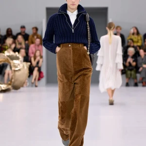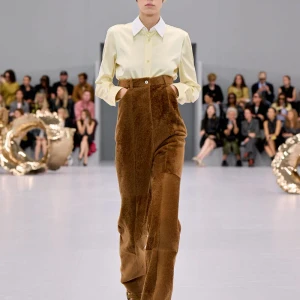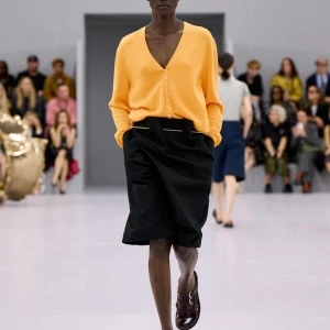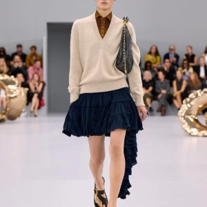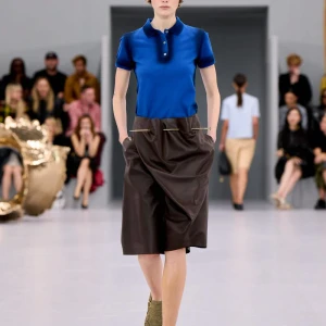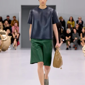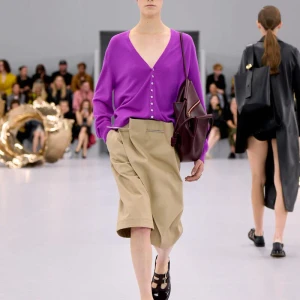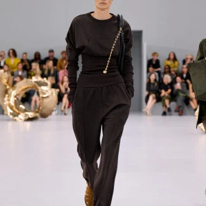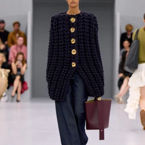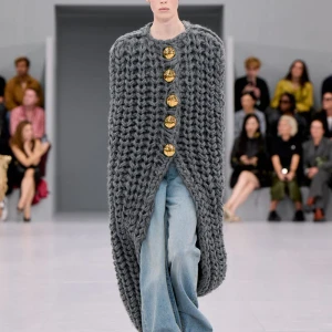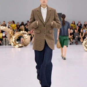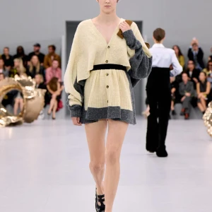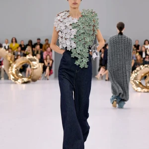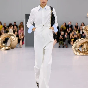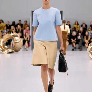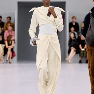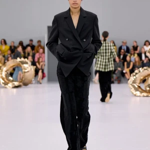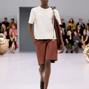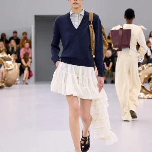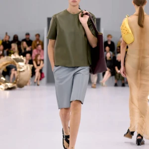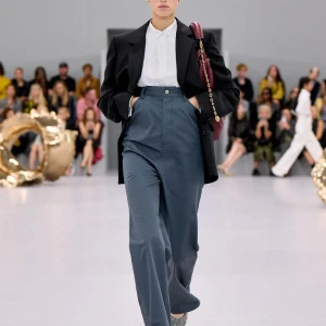 Kể từ hậu đại dịch, Loewe gây tiếng vang với những bộ sưu tập theo chủ nghĩa siêu thực như trang phục phủ cỏ xanh, áo hoa hồng môn, giày bong bóng, áo len argyle, hoodie pixel… Thế nhưng ở bộ sưu tập Xuân – Hè 2024, Loewe bỗng trở nên tối giản hơn, nền nã hơn. Những chi tiết rườm rà được loại bỏ khỏi trang phục. Thay vào đó, các thiết kế tập trung vào việc khai phá tỷ lệ, sử dụng những món đồ mặc hàng ngày, thêm thắt những chi tiết đặc biệt thông qua kiểu dáng và chi tiết và xử lý chất liệu. Đó là những chiếc quần cạp cao bất đối xứng với tỷ lệ cơ thể, bộ trang phục dáng hình hộp với áo phông và quần có đường viền cắt sắc gọn, những chiếc áo dệt kim không tay đính cúc khổng lồ ấn tượng… Tất cả đều thể hiện rõ sự khiêm nhường đặc trưng của phong cách “normcore” trong trang phục thường nhật.