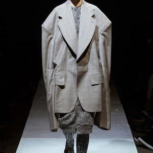 Được bao trùm bởi một màu đen và ánh đèn mờ, không gian show diễn tạo cảm giác âm u và ma mị. Xuất hiện đầu tiên là chiếc áo vest xám to với tay áo dài kéo rủ cả phần thân trên của người mẫu. Đây là sự khởi đầu gần gũi và ‘bình thường’ nhất cho một chuỗi những thiết kế kỳ quặc tiếp sau.