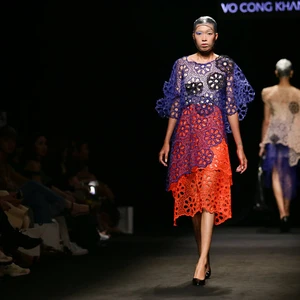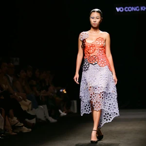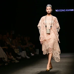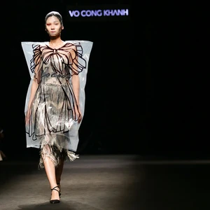 BST mang tên Cocoon với những đường cắt hình tròn được thêu đục trên nhiều lớp chất liệu mỏng dầy tạo hiệu ứng layer. Cách xử lý trên cấu trúc tạo khối 3D quen thuộc của NTK được thể hiện qua nhiều mẫu váy, áo khoác. Với một cá tính thời trang mạnh mẽ, những mẫu váy ren của Võ Công Khanh cũng ẩn chứa nhiều nét phóng khoáng.
