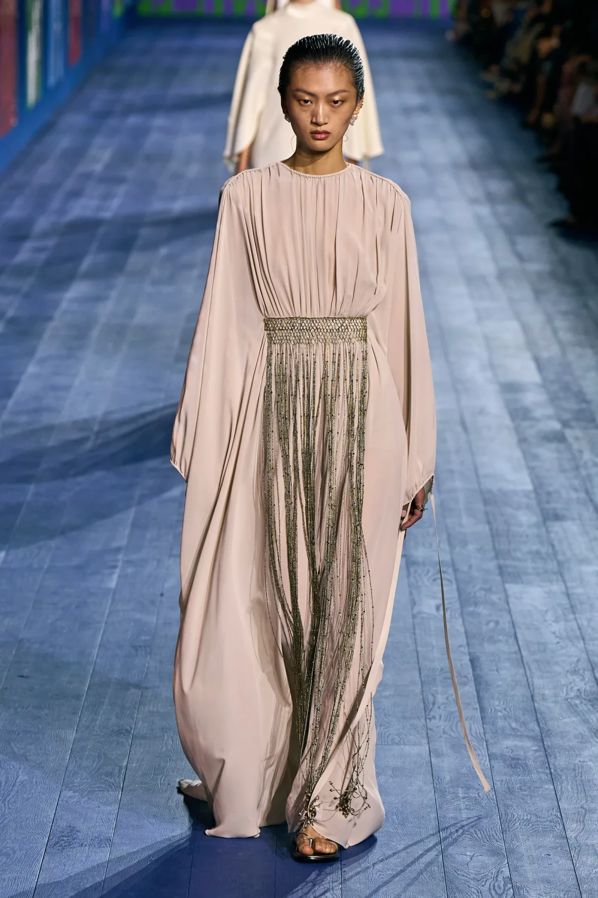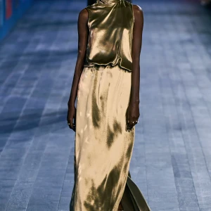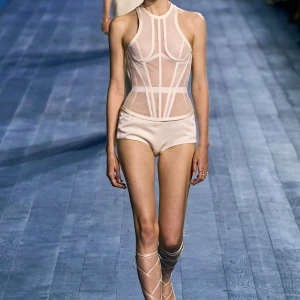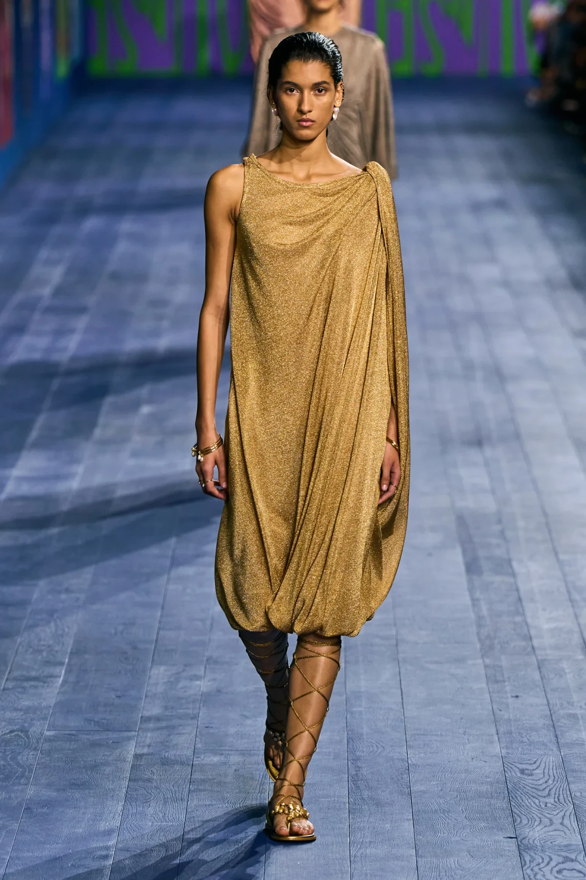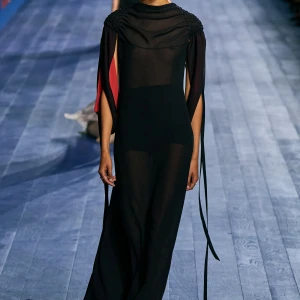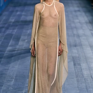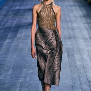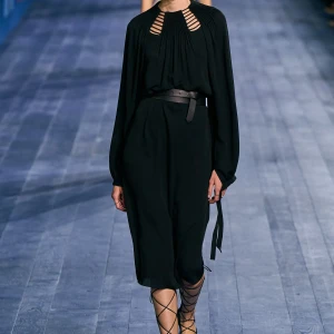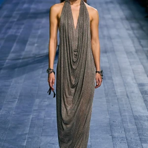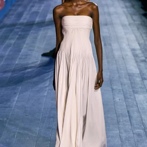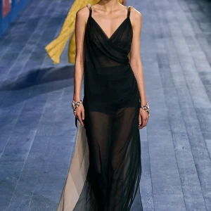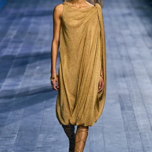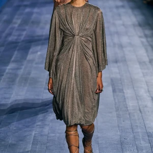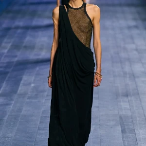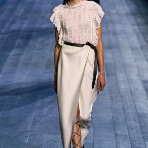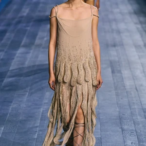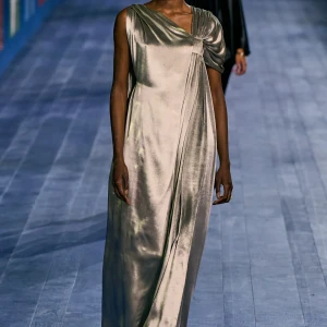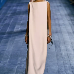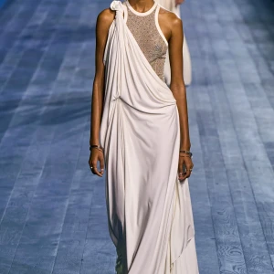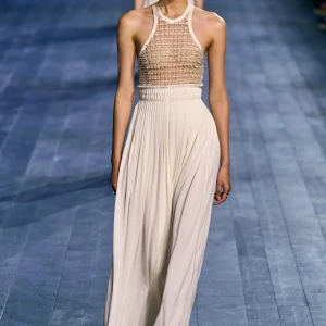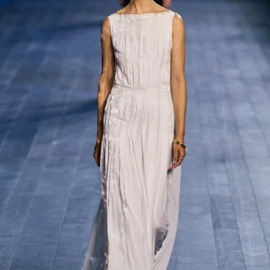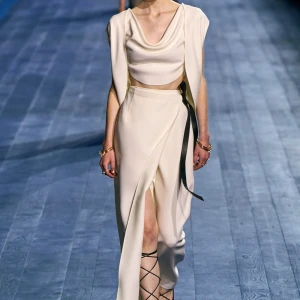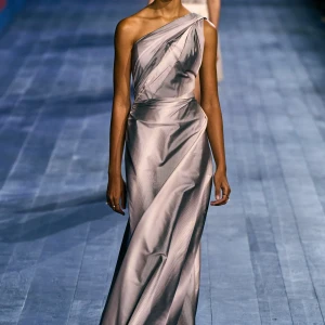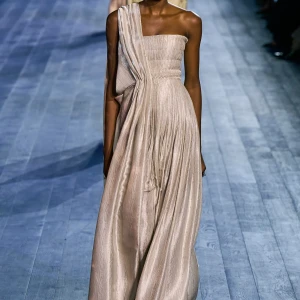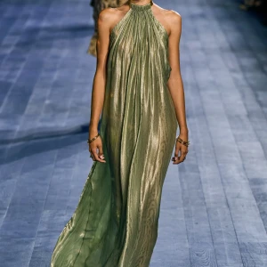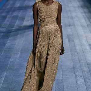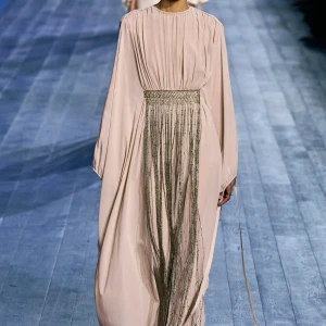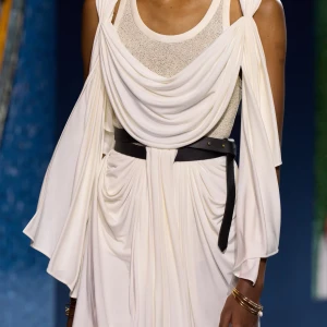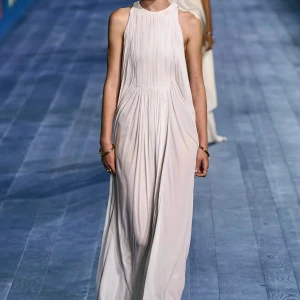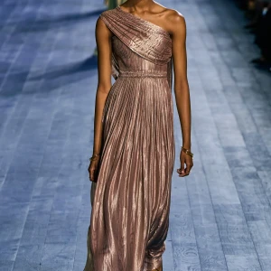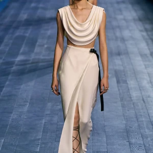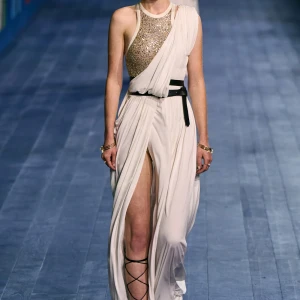 Peplos, trang phục xếp nếp truyền thống của phụ nữ Hy lạp cổ đại, được tái hiện một cách tinh tế, tôn vinh vẻ đẹp thanh lịch và vượt thời gian. Lấy cảm hứng từ một bức ảnh từ năm 1948, Dior đã tái hiện peplos bằng chất liệu voan mềm mại, nhẹ nhàng. Chất liệu jersey được sử dụng cho phần áo, mang đến sự sang trọng và hiện đại. Thay vì bó buộc cơ thể trong áo nịt ngực truyền thống, NTK sử dụng áo ba lỗ và áo liền quần, tạo nên sự tự do và thoải mái.