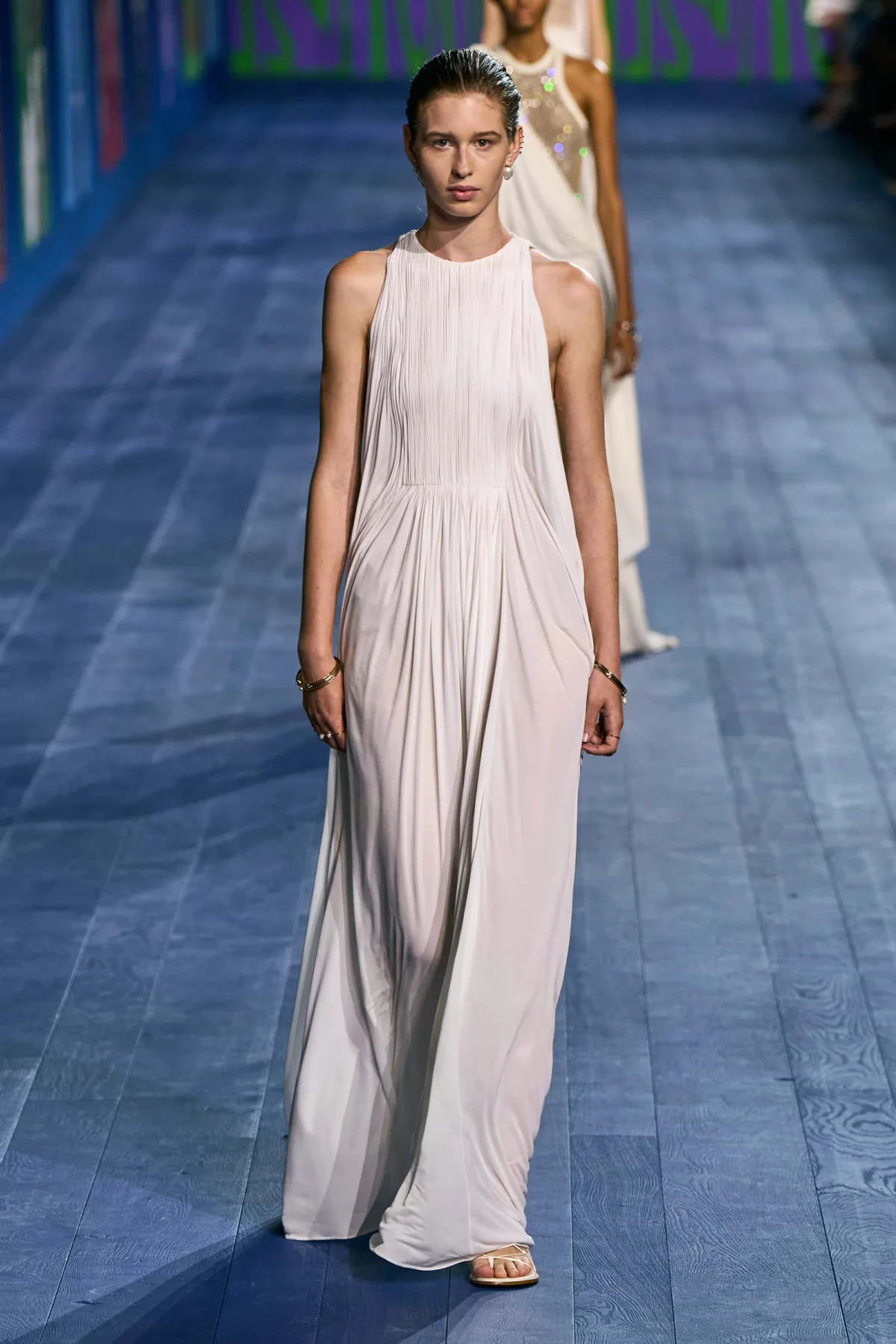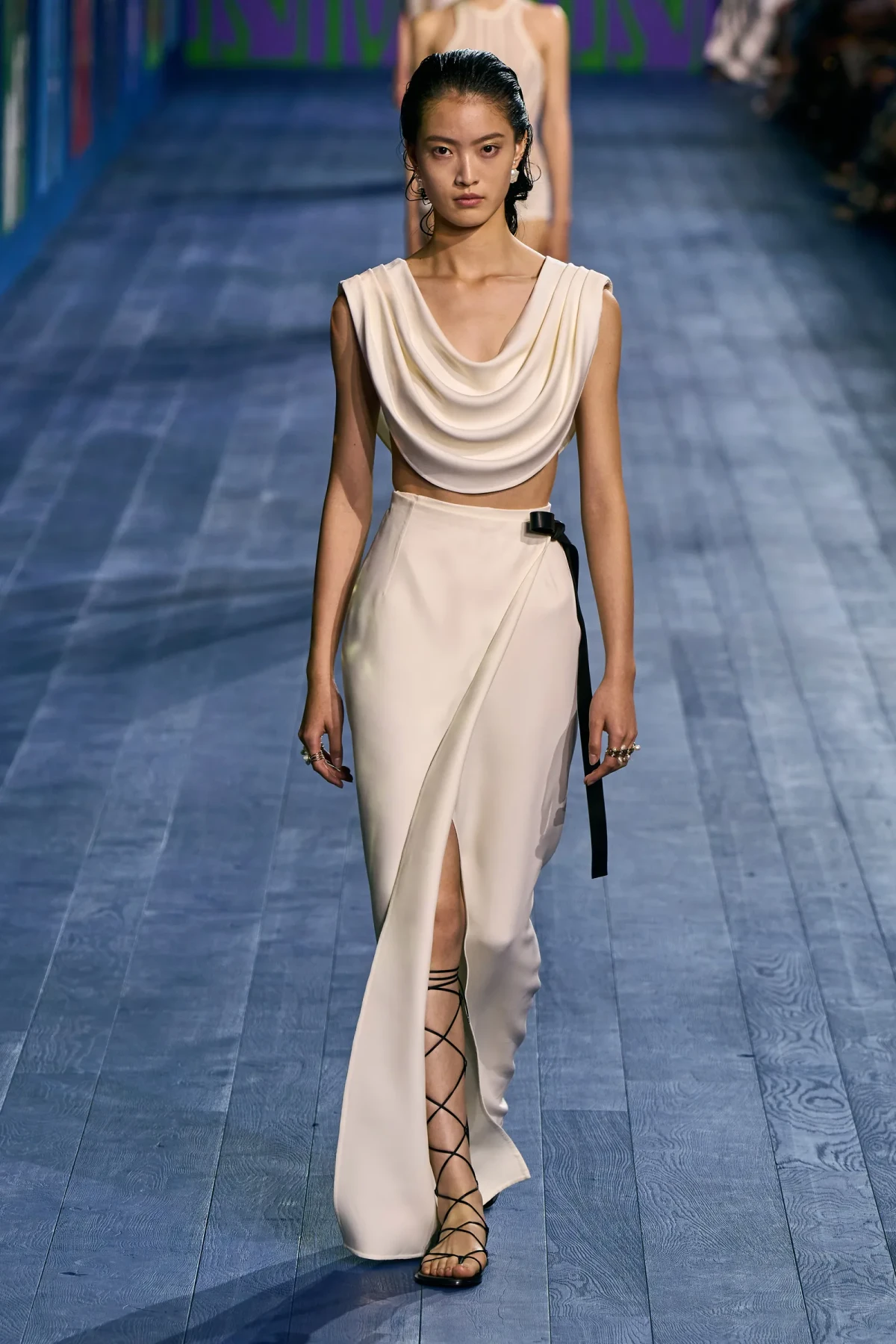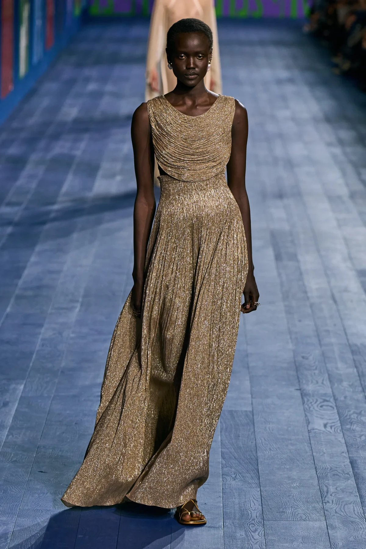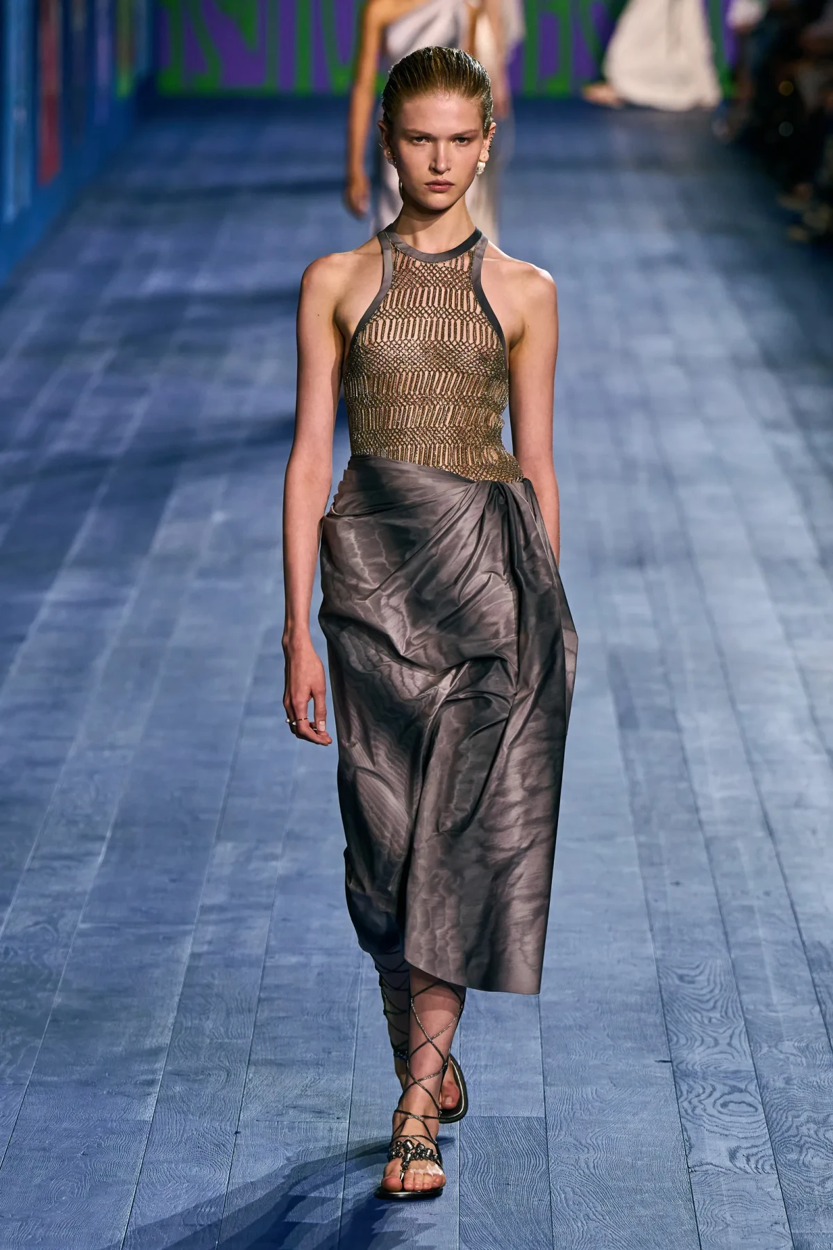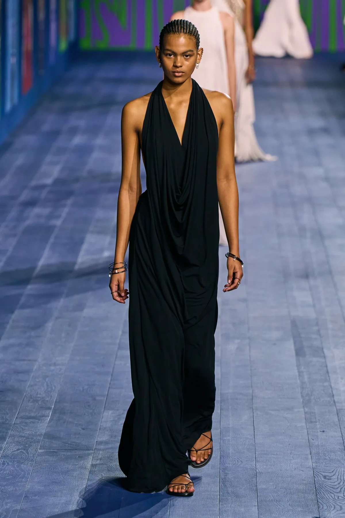 Peplos, trang phục xếp nếp truyền thống của phụ nữ Hy lạp cổ đại, được tái hiện một cách tinh tế, tôn vinh vẻ đẹp thanh lịch và vượt thời gian. Lấy cảm hứng từ một bức ảnh từ năm 1948, Dior đã tái hiện peplos bằng chất liệu voan mềm mại, nhẹ nhàng. Chất liệu jersey được sử dụng cho phần áo, mang đến sự sang trọng và hiện đại. Thay vì bó buộc cơ thể trong áo nịt ngực truyền thống, NTK sử dụng áo ba lỗ và áo liền quần, tạo nên sự tự do và thoải mái.