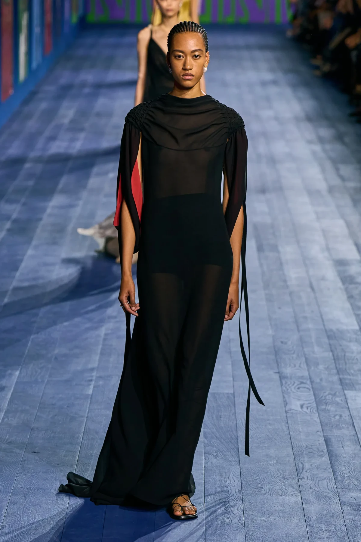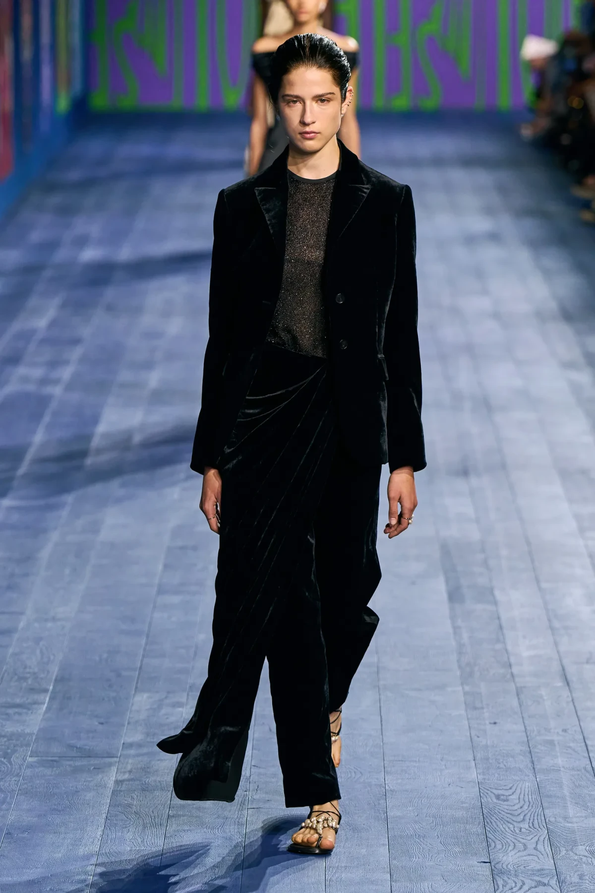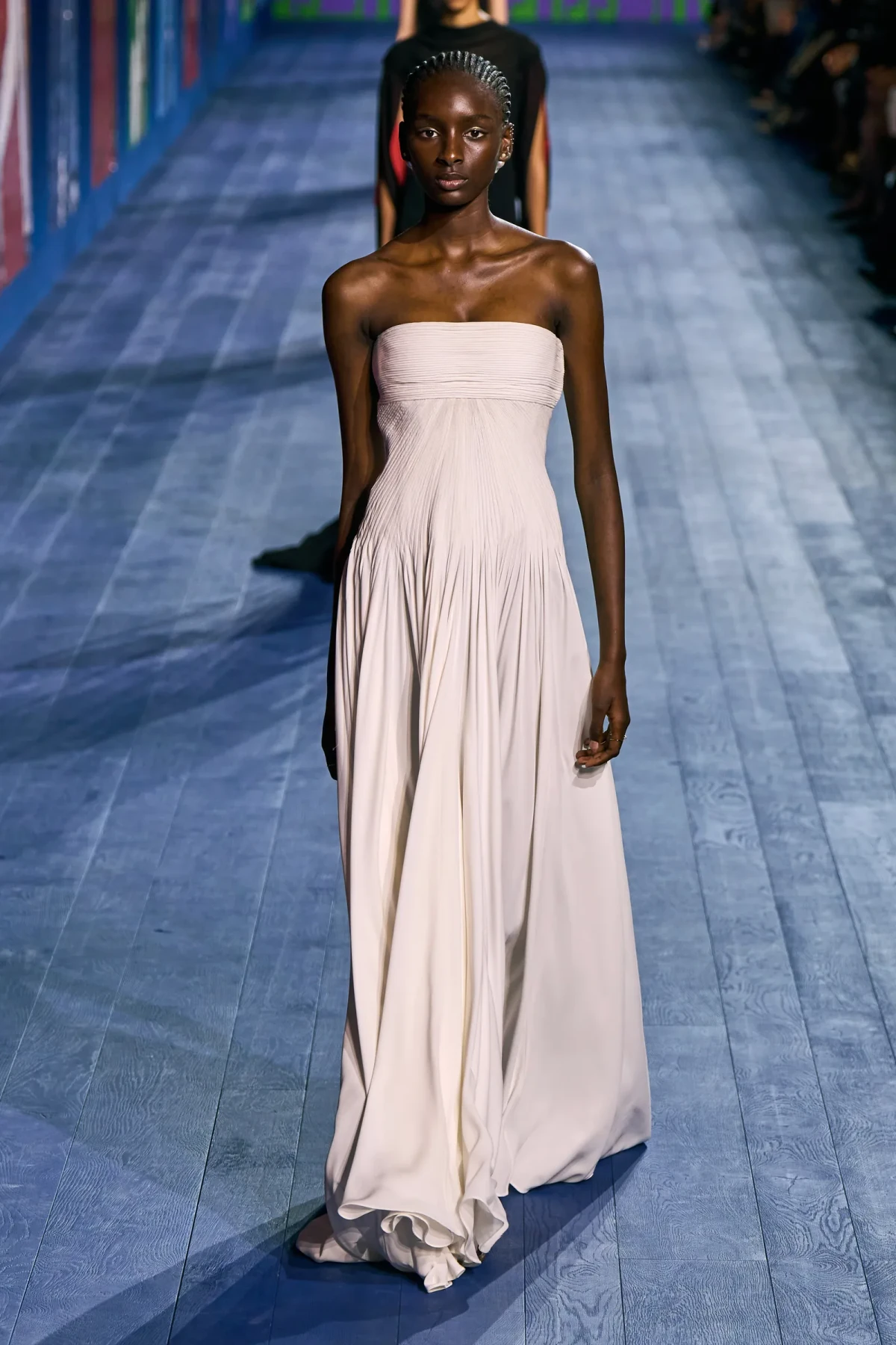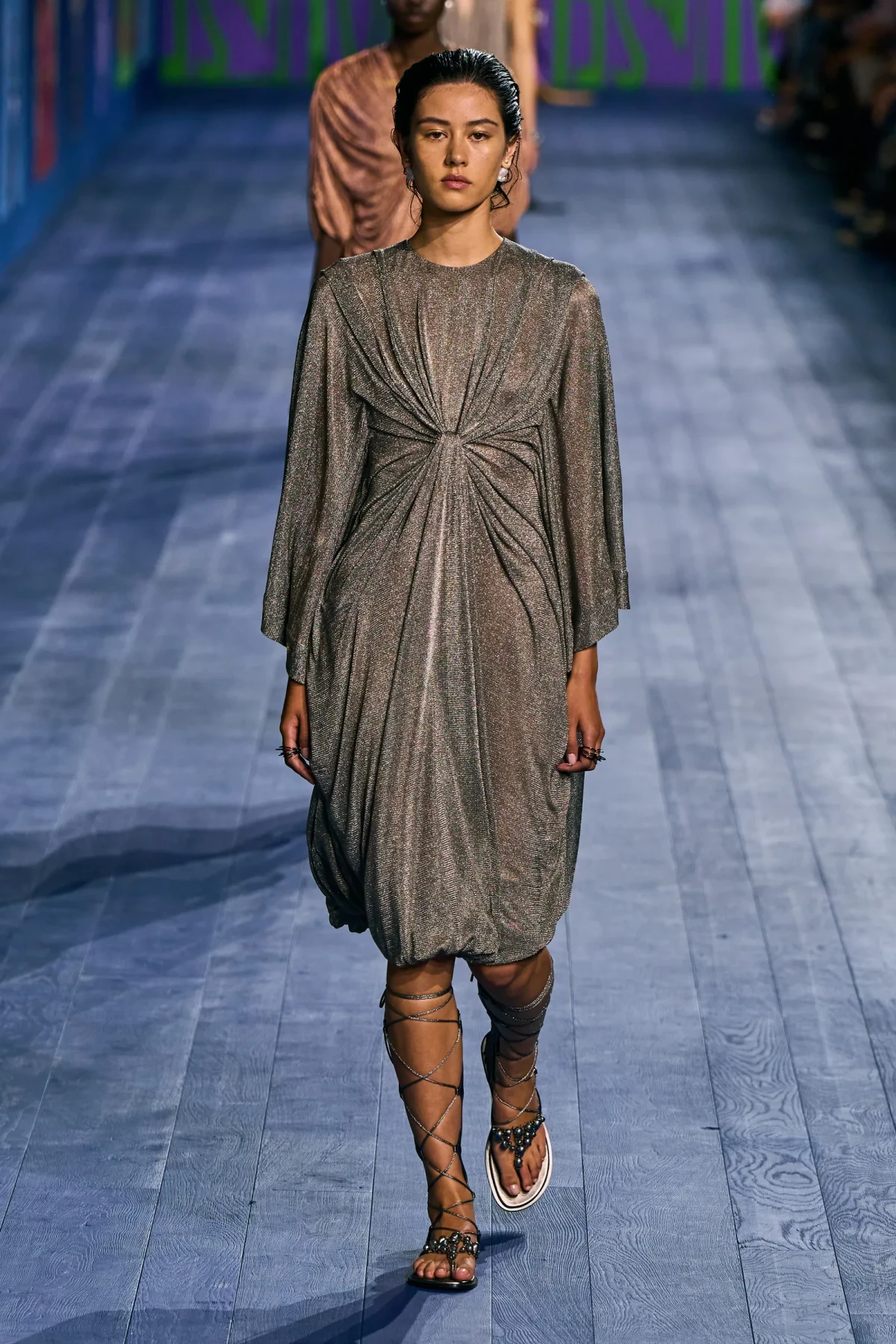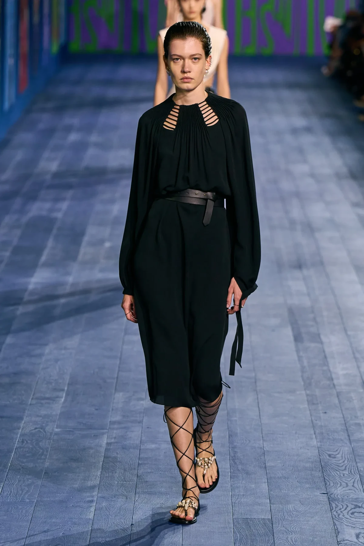 Peplos, trang phục xếp nếp truyền thống của phụ nữ Hy lạp cổ đại, được tái hiện một cách tinh tế, tôn vinh vẻ đẹp thanh lịch và vượt thời gian. Lấy cảm hứng từ một bức ảnh từ năm 1948, Dior đã tái hiện peplos bằng chất liệu voan mềm mại, nhẹ nhàng. Chất liệu jersey được sử dụng cho phần áo, mang đến sự sang trọng và hiện đại. Thay vì bó buộc cơ thể trong áo nịt ngực truyền thống, NTK sử dụng áo ba lỗ và áo liền quần, tạo nên sự tự do và thoải mái.