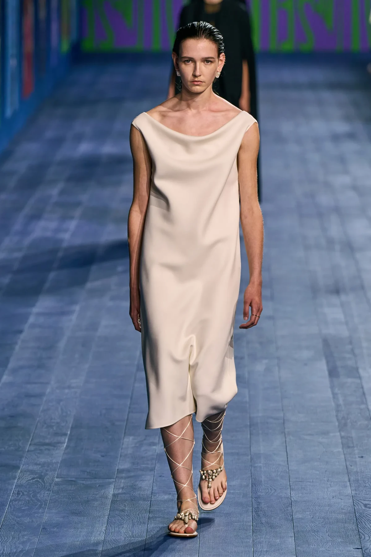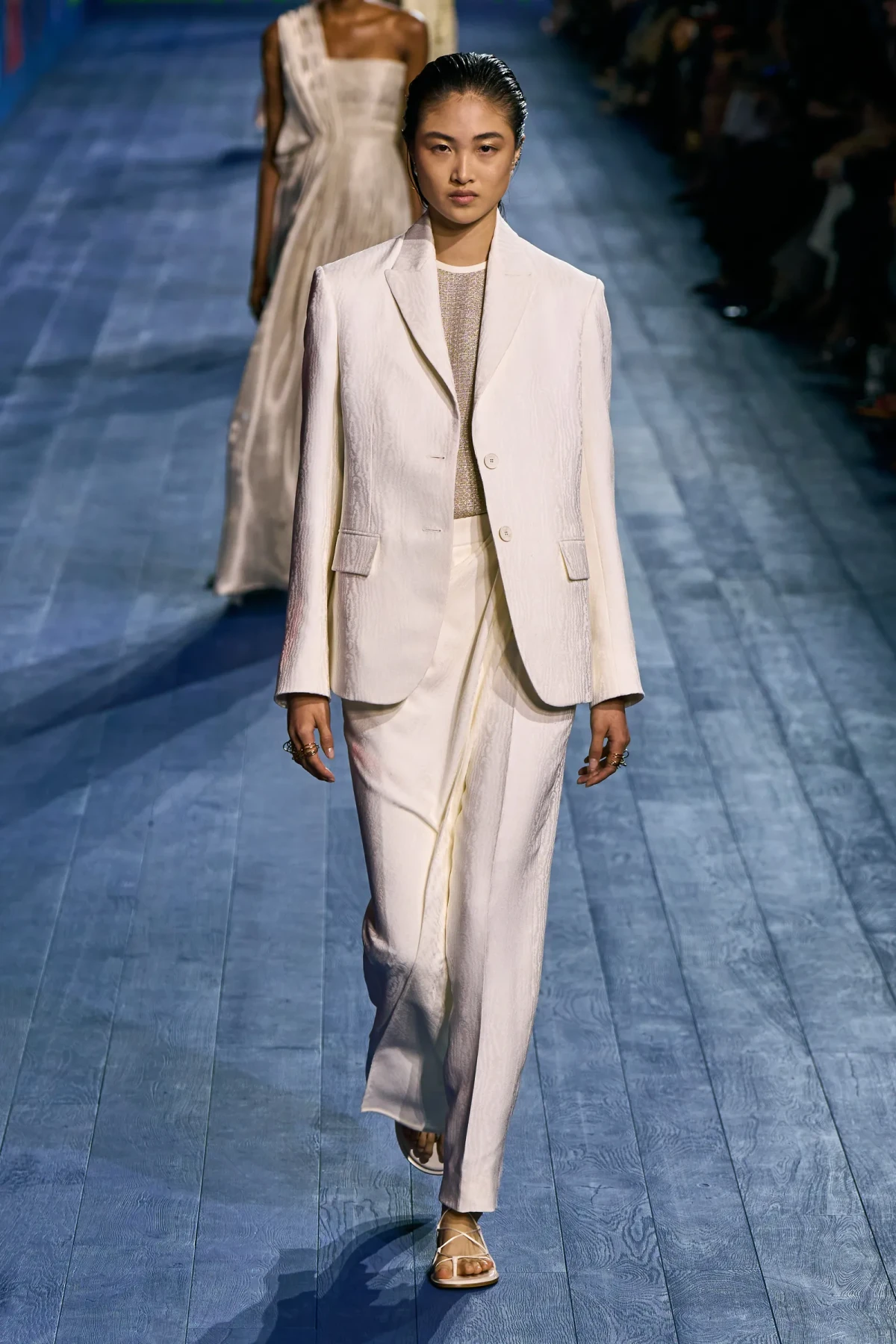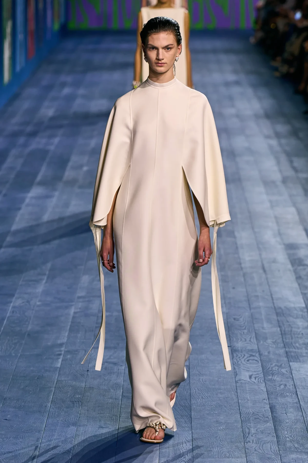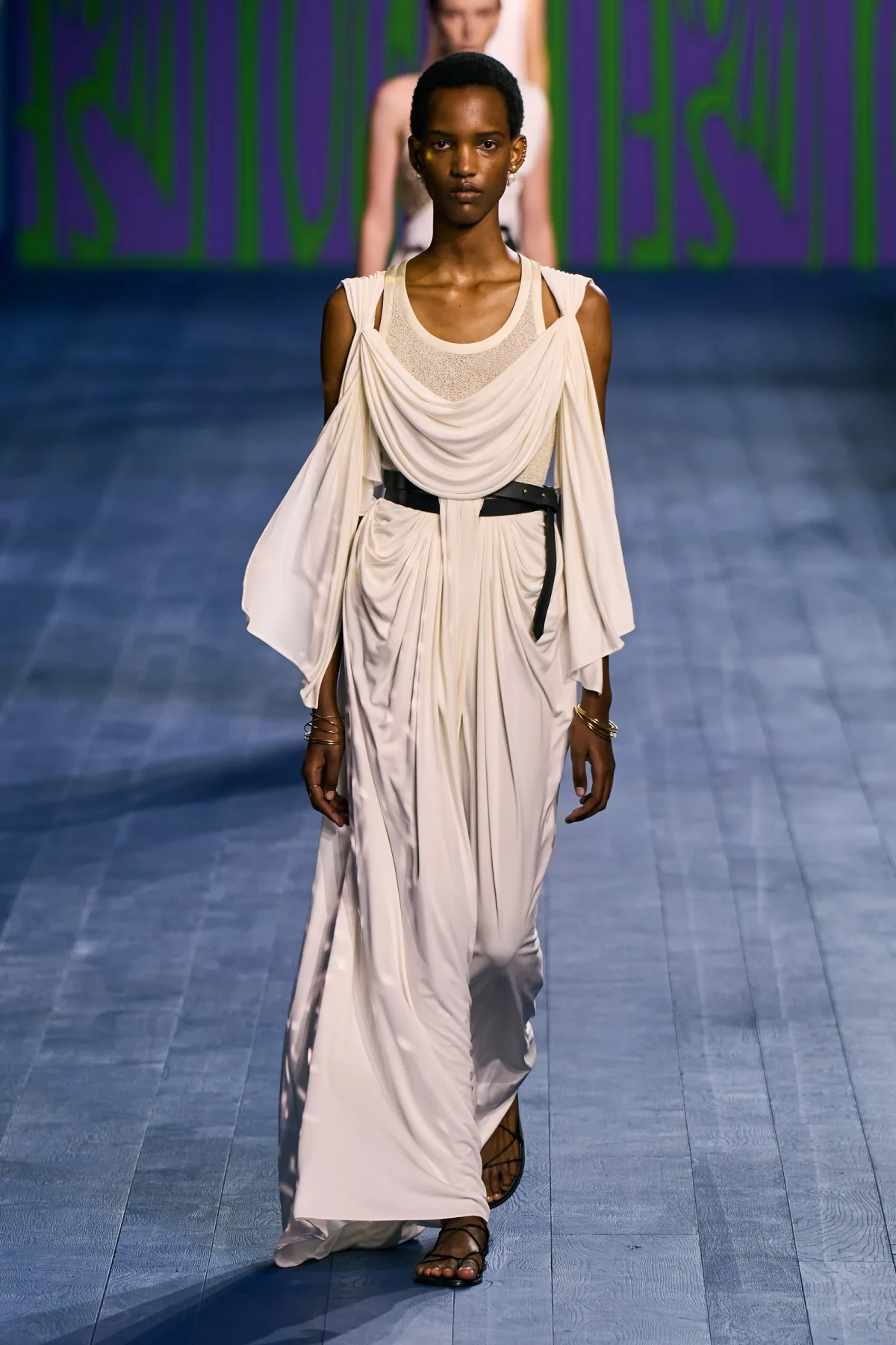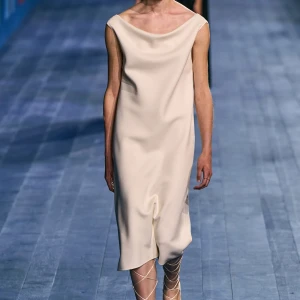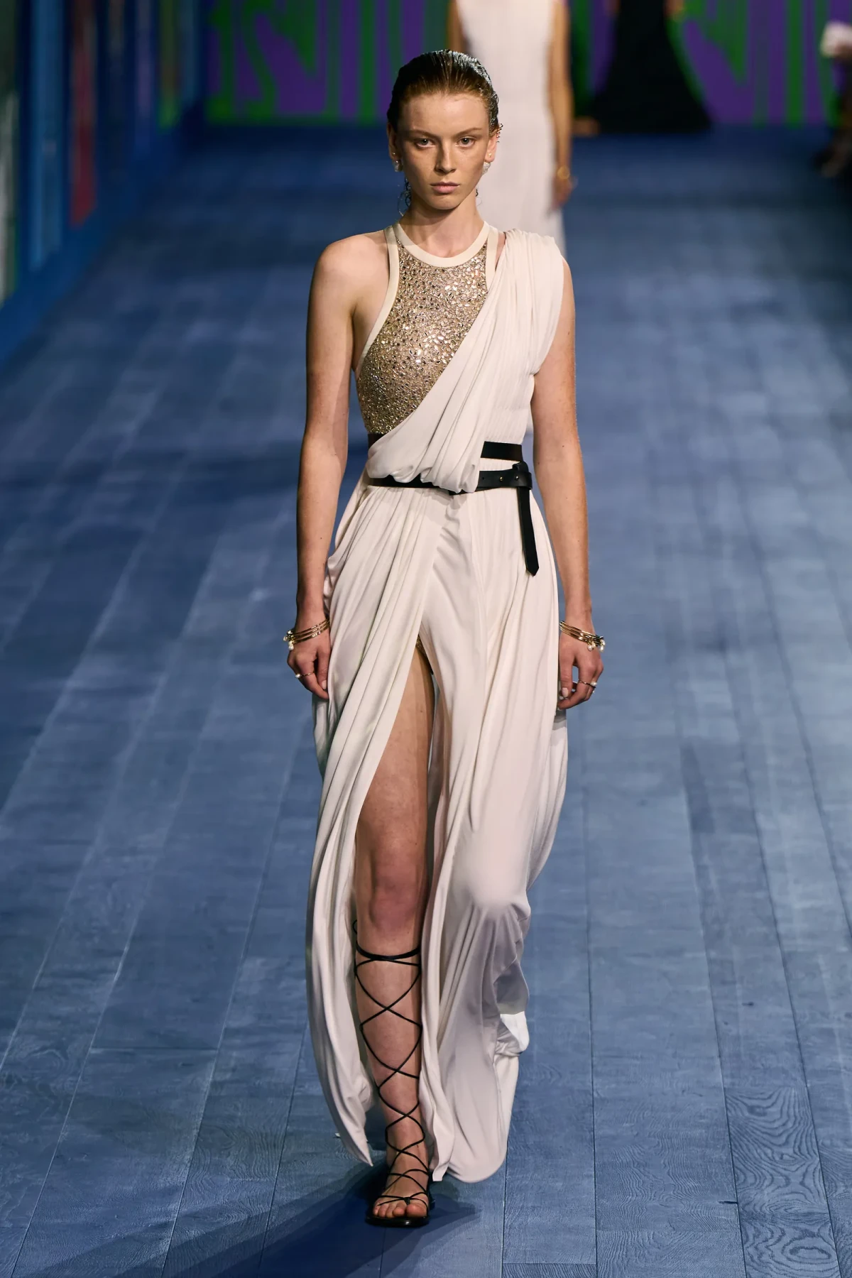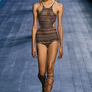 Dù vẫn giữ được vẻ trang trọng vốn có, các thiết kế của Dior mang hơi thở thể thao mạnh mẽ. Dép quai ngang da đơn giản hoàn thiện bộ trang phục, gợi nhớ đến hình ảnh những vận động viên đầy tự tin trên sàn đấu. Mặc dù có thể peplos không phù hợp cho môn nhảy cao, nhưng chắc chắn nó sẽ là lựa chọn hoàn hảo cho môn ném lao – môn thể thao được bổ sung sau này vào Thế vận hội.