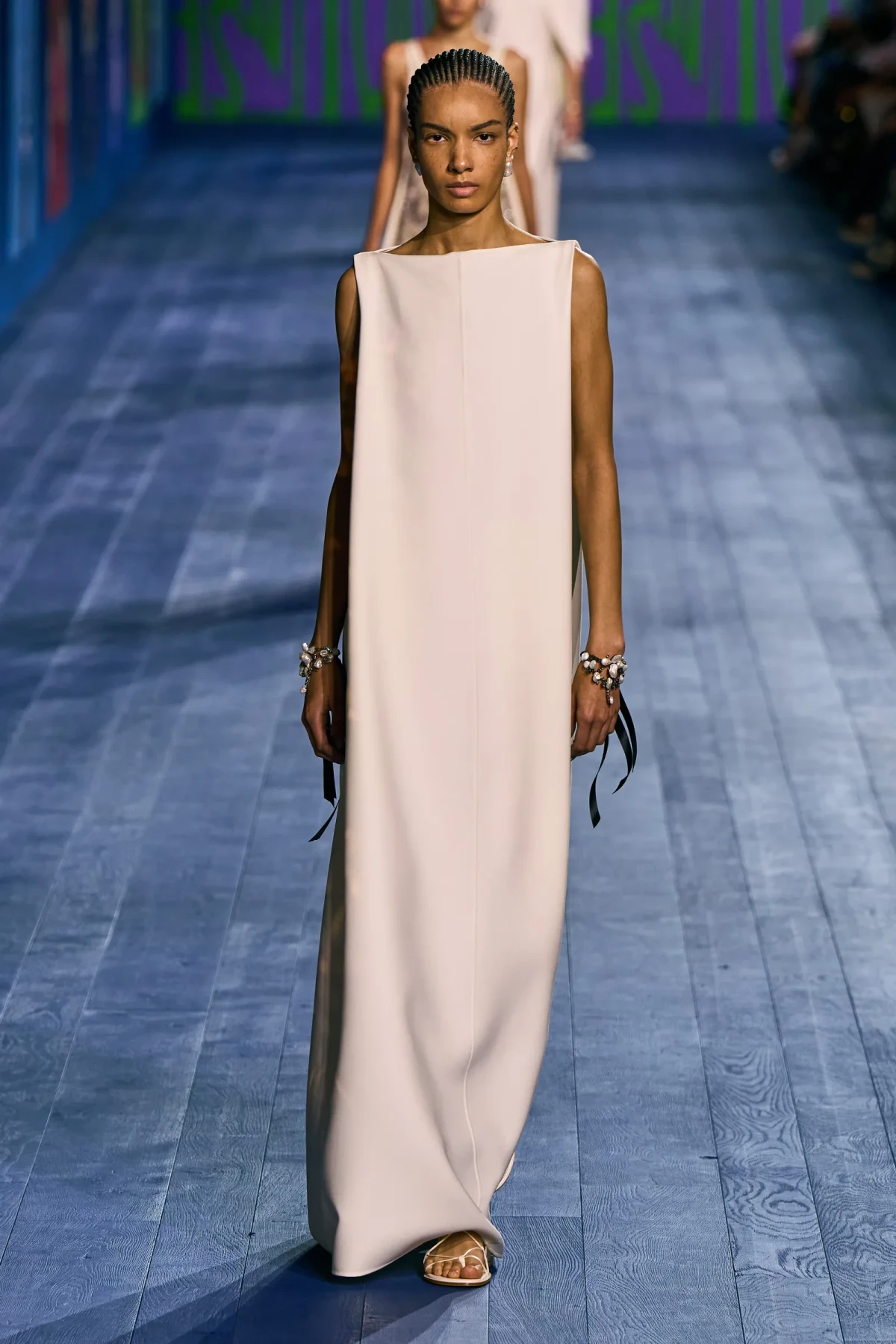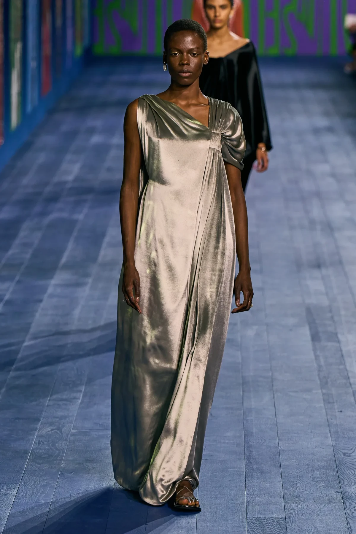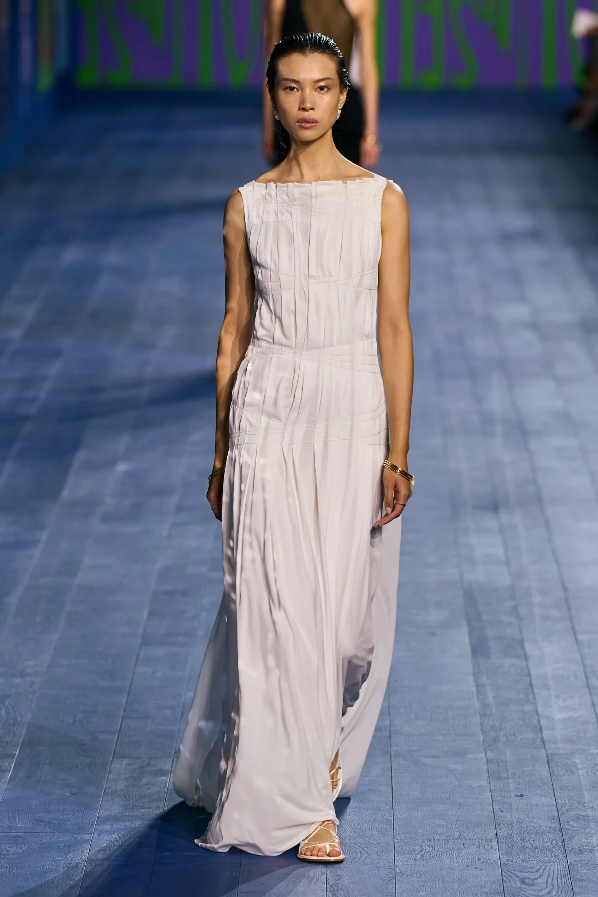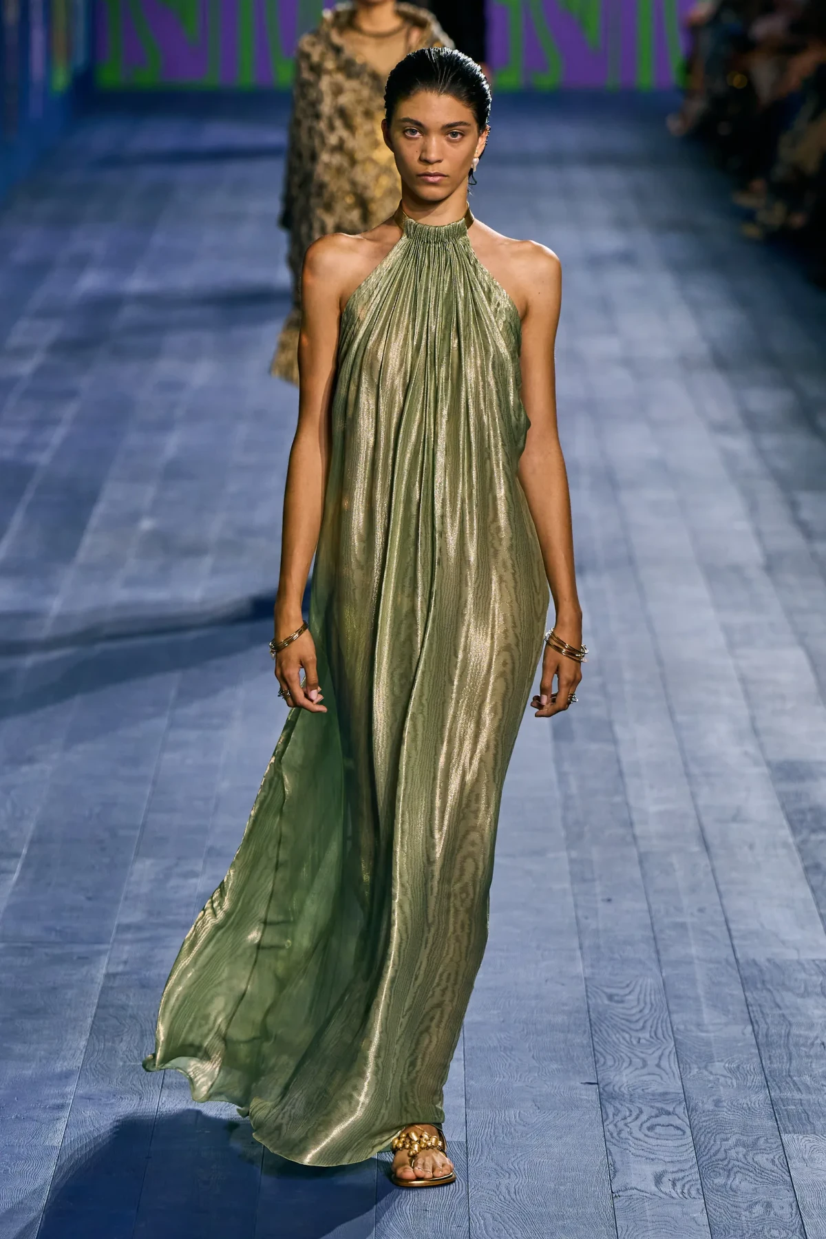 Dù vẫn giữ được vẻ trang trọng vốn có, các thiết kế của Dior mang hơi thở thể thao mạnh mẽ. Dép quai ngang da đơn giản hoàn thiện bộ trang phục, gợi nhớ đến hình ảnh những vận động viên đầy tự tin trên sàn đấu. Mặc dù có thể peplos không phù hợp cho môn nhảy cao, nhưng chắc chắn nó sẽ là lựa chọn hoàn hảo cho môn ném lao – môn thể thao được bổ sung sau này vào Thế vận hội.