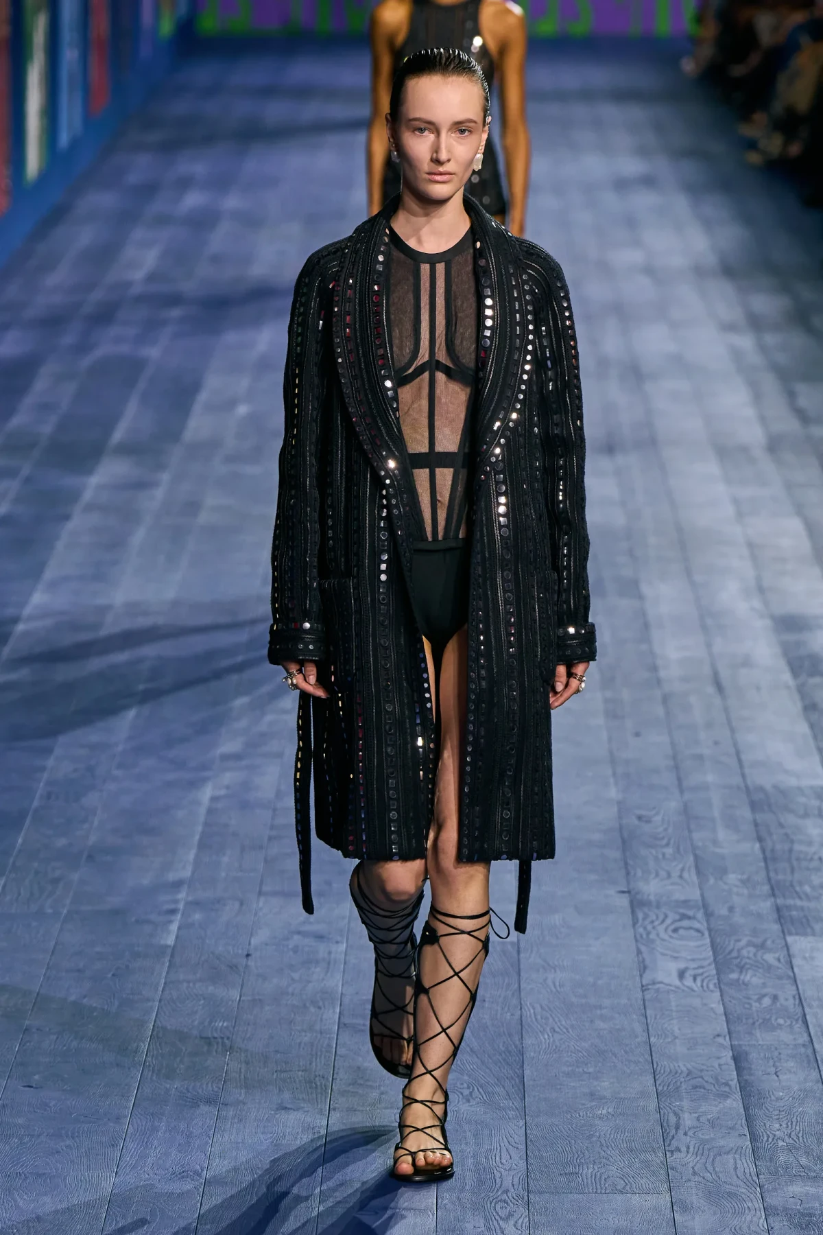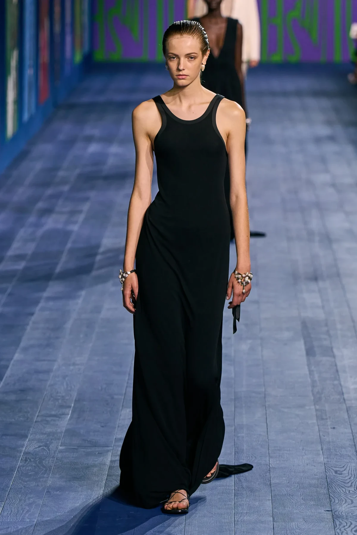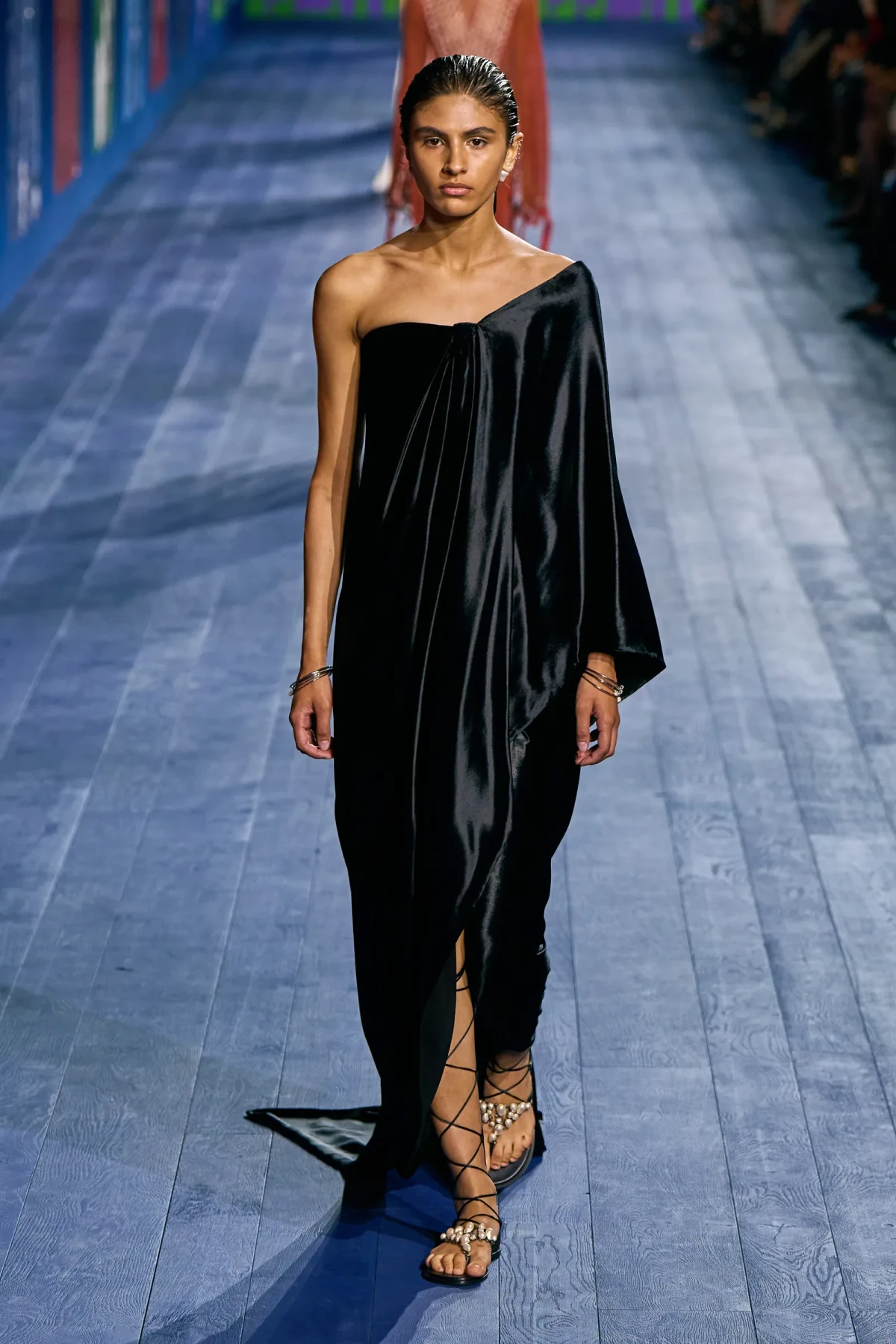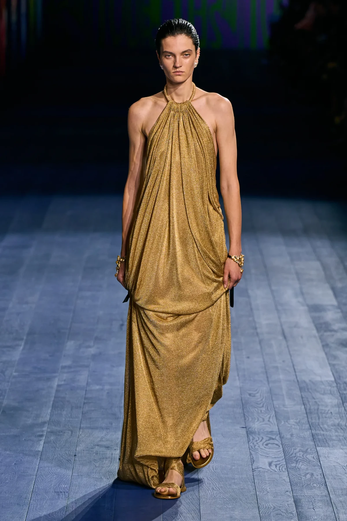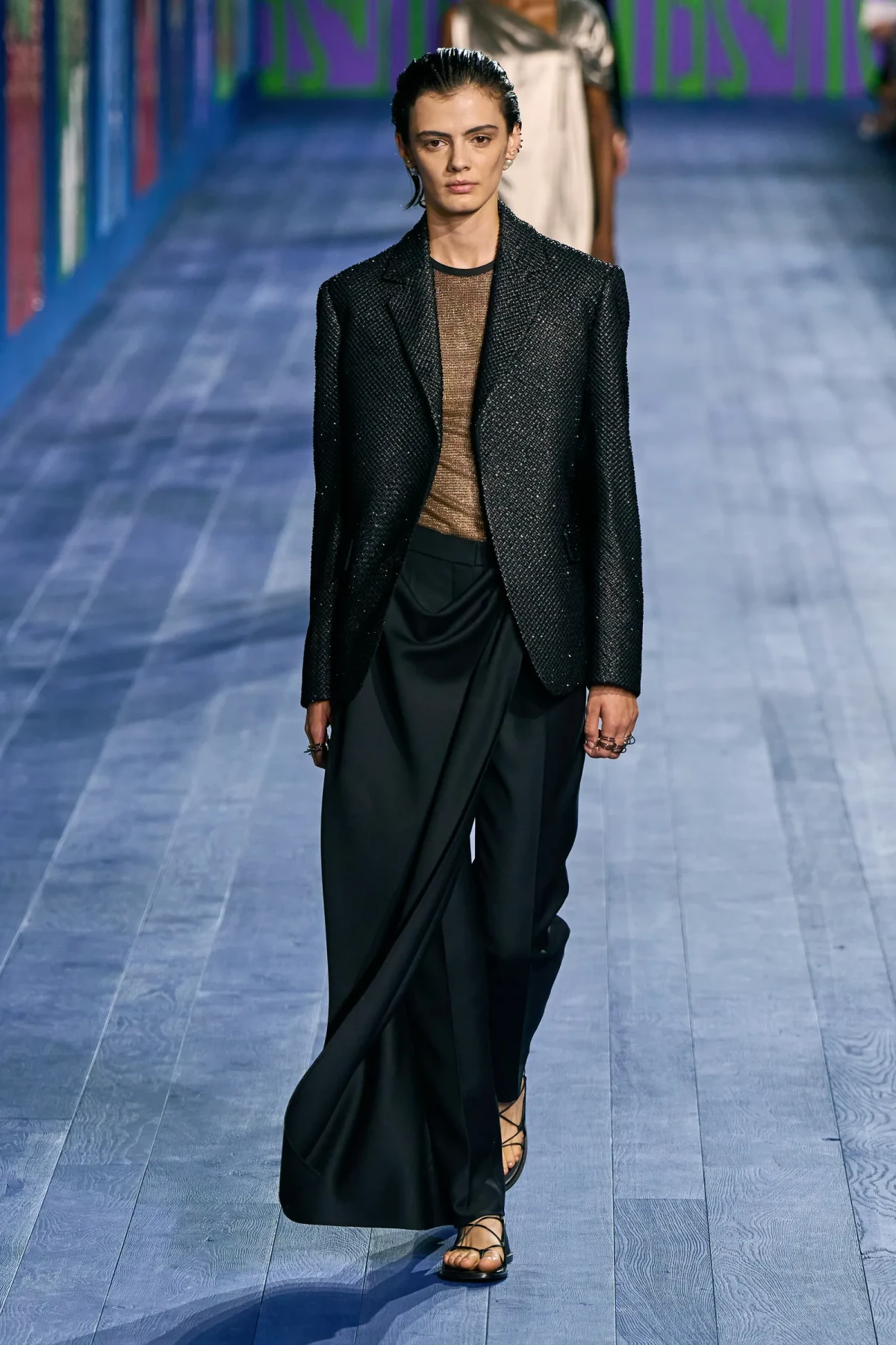 Dù vẫn giữ được vẻ trang trọng vốn có, các thiết kế của Dior mang hơi thở thể thao mạnh mẽ. Dép quai ngang da đơn giản hoàn thiện bộ trang phục, gợi nhớ đến hình ảnh những vận động viên đầy tự tin trên sàn đấu. Mặc dù có thể peplos không phù hợp cho môn nhảy cao, nhưng chắc chắn nó sẽ là lựa chọn hoàn hảo cho môn ném lao – môn thể thao được bổ sung sau này vào Thế vận hội.