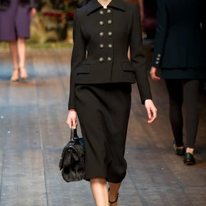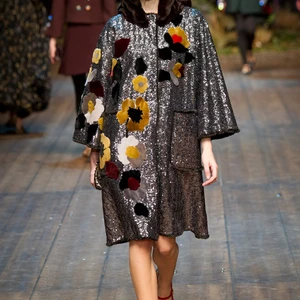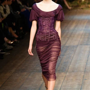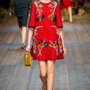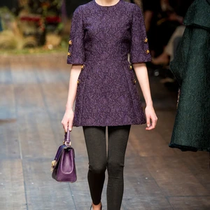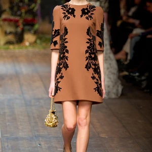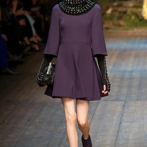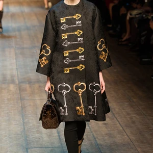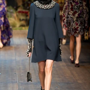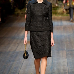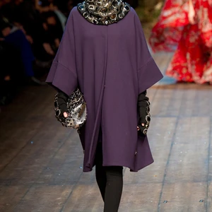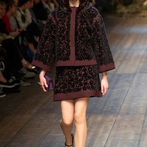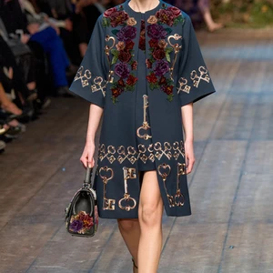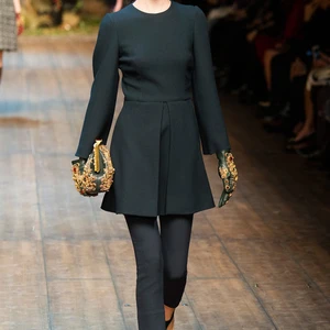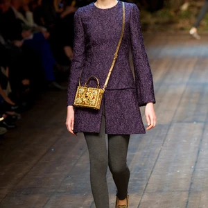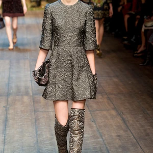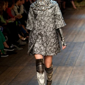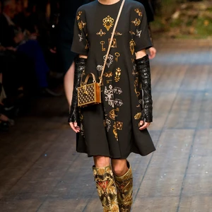 Lấy cảm hứng từ trang phục của kỵ binh, Dolce&Gabbana tạo nên sự kết hợp lạ mắt giữa phần áo giáp trùm đầu và găng tay dài đính đá trang sức sắc sảo. Đi cùng là váy chữ A phom dáng đơn giản nhưng chất liệu gấm thêu cầu kì.