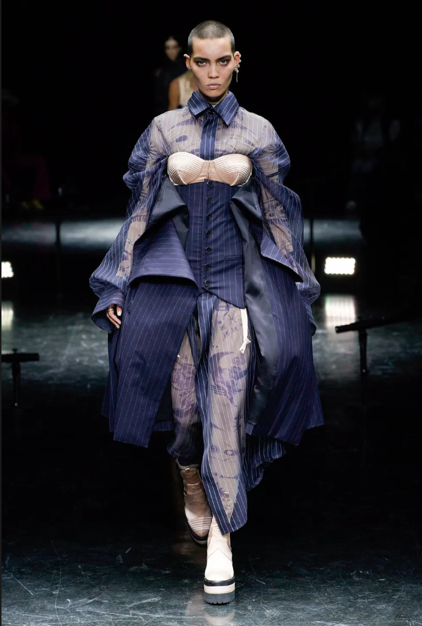 Có thể thấy gần như tất cả dấu ấn cá nhân của Jean Paul Gaultier được sử dùng làm chất liệu cho “đầu bếp” Chitose Abe dọn ra một bàn ăn thật thịnh soạn: Áo corset ngực nhọn, áo manteau, suit tuxedo kẻ sọc, sọc thủy thủ, họa tiết xăm trổ và denim. Thật tuyệt vời khi chúng ta được thấy những giá trị của Gaultier được mang màu sắc tái cấu trúc phóng khoáng và hiện đại qua cách Chitose đưa áo phao, áo bomber MA-1 vào các thiết kế couture một cách tự nhiên.
