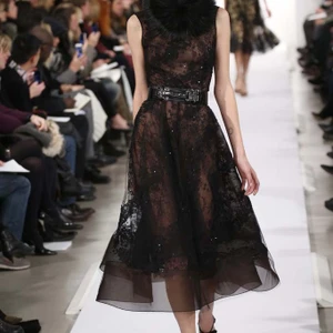 Dường như chất liệu ren và những họa tiết in hoa lá đơn sắc xuất hiện dày đặt hơn trên các sàn diễn thời trang New York Thu Đông 2014. Bộ sưu tập của Oscar de la Renta cũng không là một ngoại lệ, ông tận dụng hai xu hướng này trong các mẫu đầm xòe và đầm dạ hội không tay ở cuối show diễn. Tua rua cũng được nhà thiết kế sử dụng bắt mắt trên hai mẫu đầm dài hình trụ màu trắng và nâu đồng.