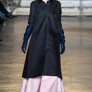 Khó có thể bỏ qua những chiếc găng tay da bóng đủ màu ngộ nghĩnh – từ những xanh đen, đỏ bordeaux cho đến vàng chanh, xanh trời và cam. Chúng đi kèm với những mẫu áo khoác camel ngắn hay những chiếc đầm chữ A họa tiết thêu hoa sang trọng. Sự kết hợp có vẻ khập khiễng khi màu sắc những chiếc găng tay trông không mấy ăn khớp với thiết kế. Nhưng hẳn sự phá cách lạ mắt này lại chính là điểm tạo dấu ấn cho người xem về phong cách của Alessandro Dell’Acqua.