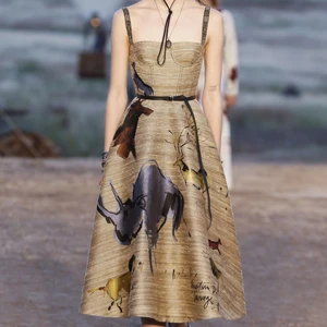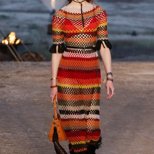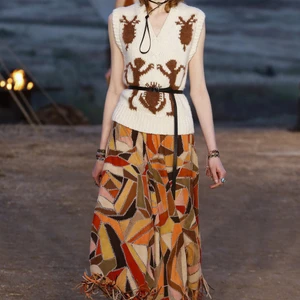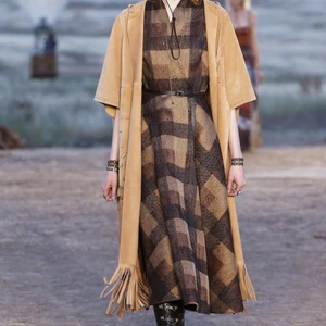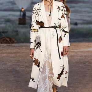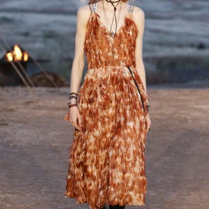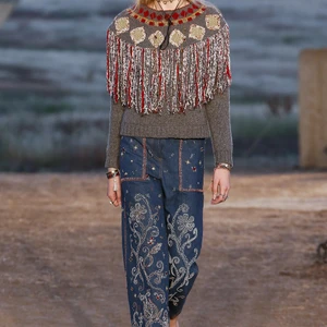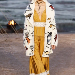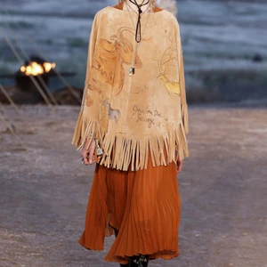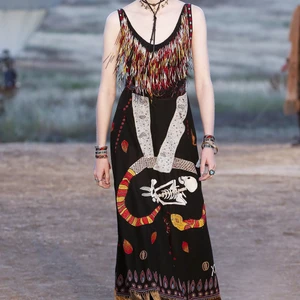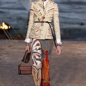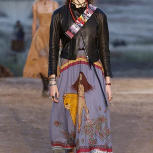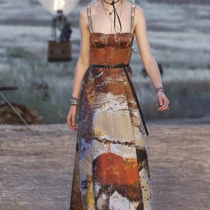Cảm hứng viễn du ngập tràn trong BST Cruise 2018 của Dior. Không còn chút ảm đạm nào ở BST mùa Thu 2017, một Dior của màu nâu đất, màu da bò cùng vô vàn họa tiết lấy cảm hứng từ những bức tranh hang động cổ xưa được phát hiện ở tây nam nước Pháp một thập kỷ trước. Chiuri đã vẽ lại các bản phác họa trong hang động lên vải lụa để lên váy và áo choàng New Look. Dường như chúng ta có thể cảm nhận một bản in trên chiếc áo choàng bông mềm mại. Ren, da, cashmere và lông… được kết hợp nhịp nhàng trên váy, áo, áo choàng. Maria Chiuri vẫn lưu giữa những phom váy dài hai dây cắt khuôn ngực từ những BST trước.