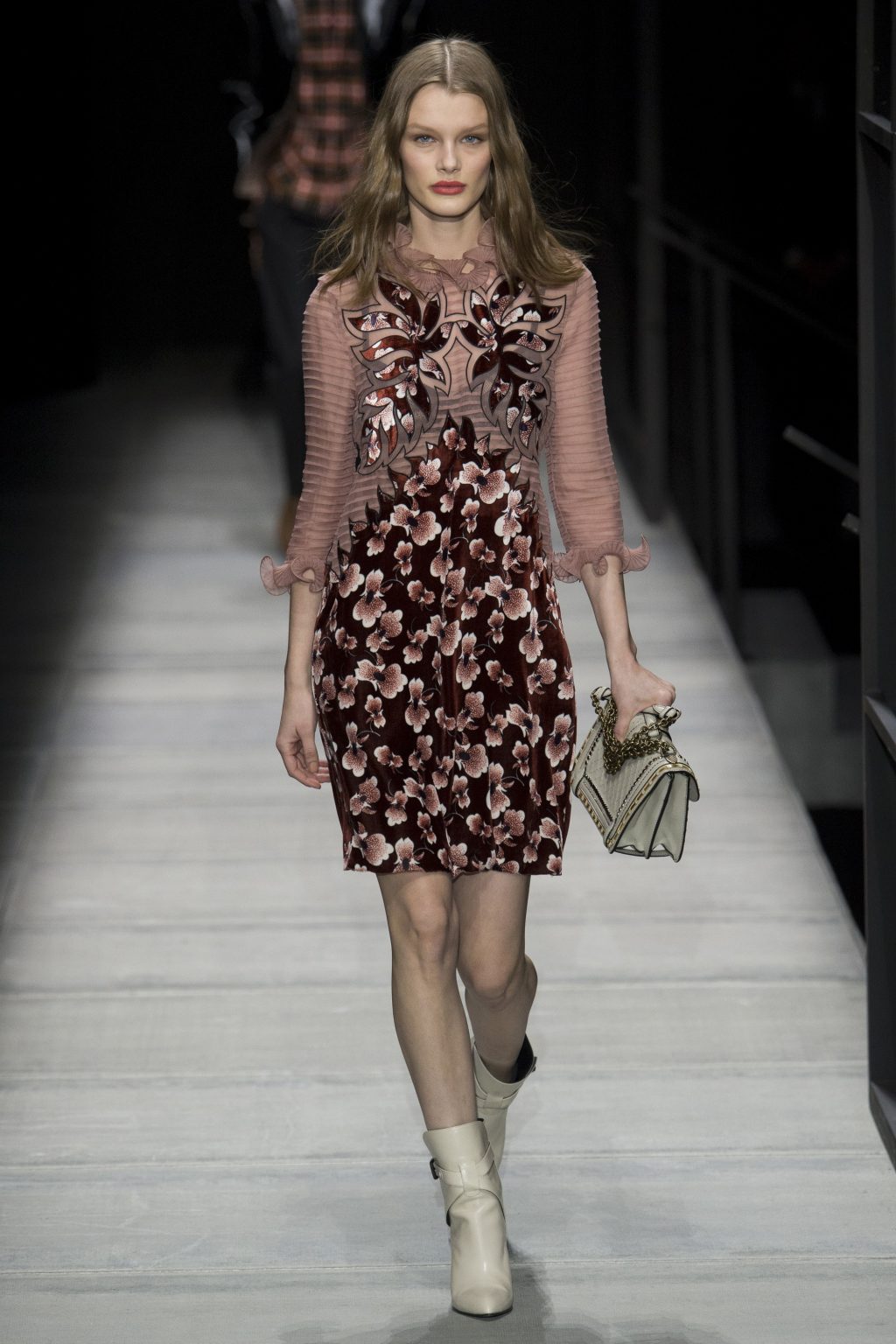 Bảng màu có phần hơi lòe loẹt chính là dẫn chứng cho những gì mà Tomas muốn nói. Tông màu marigold, rượu vang, ultra violet (theo xu hướng màu sắc 2018 của Pantone), điểm xuyết thêm một vài tông màu bổ trợ khác như vàng mù tạt, xanh lá mạ, cam đất, đen và bạc. Những phom dáng thoải mái, không gò bó, không vì thế mà khiến cho BST mùa Thu 2018 thương hiệu Bottega Veneta mất đi vẻ đẹp đầy thuyết phục cuả nó. Bề mặt chất liệu của trang phục lấy cảm hứng theo motif hình học, với những đường thẳng dày nét hay những hình khối cubic 3D đa chiều nổi bật.