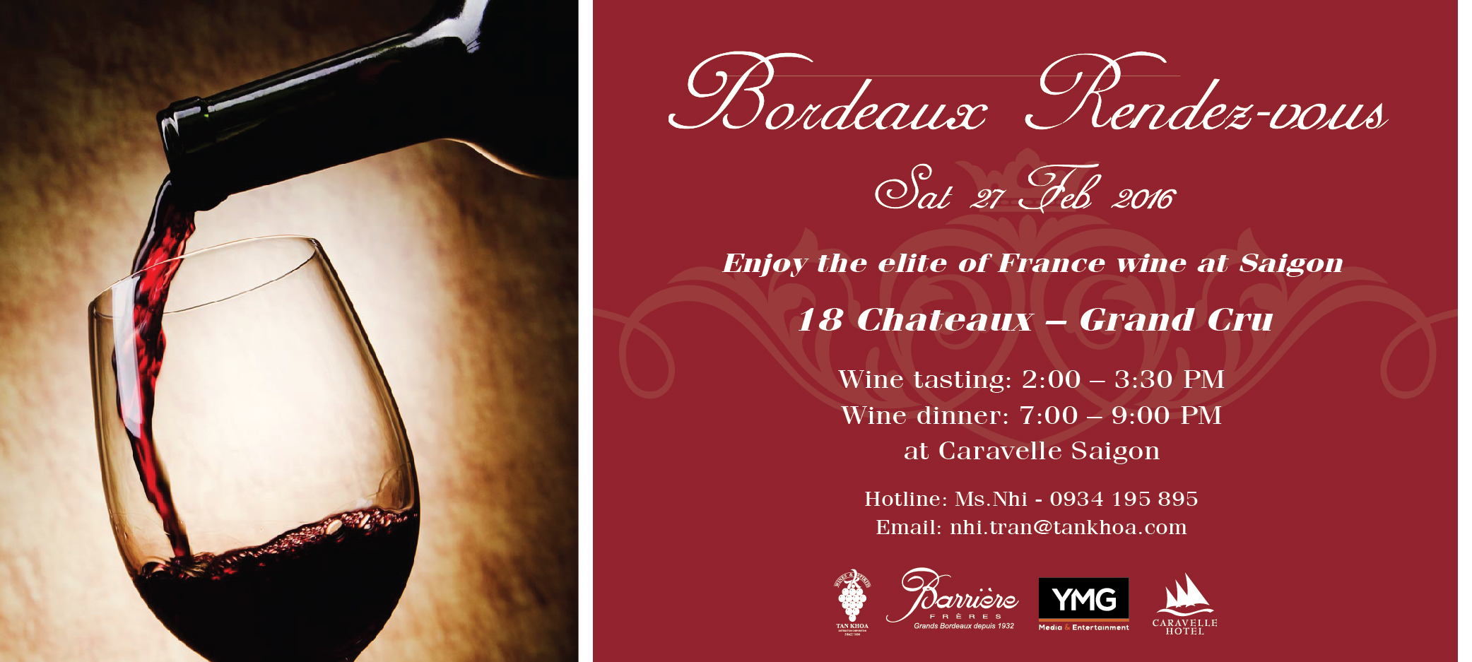 Những vị thượng khách đến tham dự chương trình sẽ được thưởng thức tinh hoa của các dòng rượu Vang cao cấp lừng danh: Chateau Beychevelle; Chateau Dassault; Chateau Guiraud; Domaine de Chevalier; Chateau Talbot; Chateau Lafon Rochet; Chateau Clerc Milon; Chateau d’Armailhac; Chateau Lagrange; Chateau Brane Cantenac; Chateau Pedesclaux; Chateau d’Issan; Chateau Cantemerle; Chateau Malartic Lagraviere; Chateau Giscours; Chateau du Tertre; Chateau Durfort Vivens; Chateau Haut Bages Liberal.