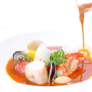 Thực đơn của nhà hàng chủ yếu được lấy cảm hứng từ ẩm thực cổ điển Pháp, với chút biến tấu độc đáo giữa ẩm thực Âu & Á.