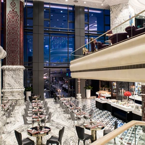 Bữa sáng và trưa của nhà hàng hấp dẫn thực khách bởi nhiều lựa chọn món khai vị và tráng miệng hấp dẫn được bài trí đầy thẩm mỹ trên chiếc bàn đá cẩm thạch. Trong khi thực đơn gọi món hàng ngày cũng làm lay động những tâm hồn sành điệu với nhiều lựa chọn món chính xuất sắc như bò nướng với trứng, cơm chiên hải sản, cá tuyết với xúc xích cay, hay tôm hùm áp chảo với tiêu đen.