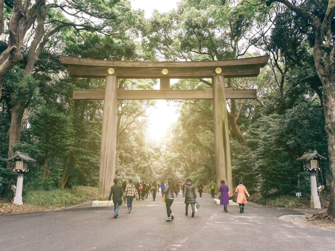 Cũng trong khu vực Harajuku, gần với phố Takeshita là đền Meiji. Meiji Jingu là thần xã nơi Thiên Hoàng của triều đại Meiji thờ phượng Thiên Hậu. Được xây dưng vào năm 1920, nơi này luôn xếp vị trí số một số lượng người đến lễ bái đầu năm. Tại đây có cổng torii bằng gỗ lớn nhất Nhật Bản, cao 12 mét, rộng 17 mét. Chỉ cần bước qua khỏi cổng, bạn sẽ tưởng như mình đã rời khỏi thành thị để tận hưởng bầu không khí yên tĩnh, trong lành nhờ hàng cây xanh mướt trải dài đến tận Omotesando. Có khoảng 100.000 cây được trồng ở đây và đều là quà tặng từ những vùng khác của Nhật.