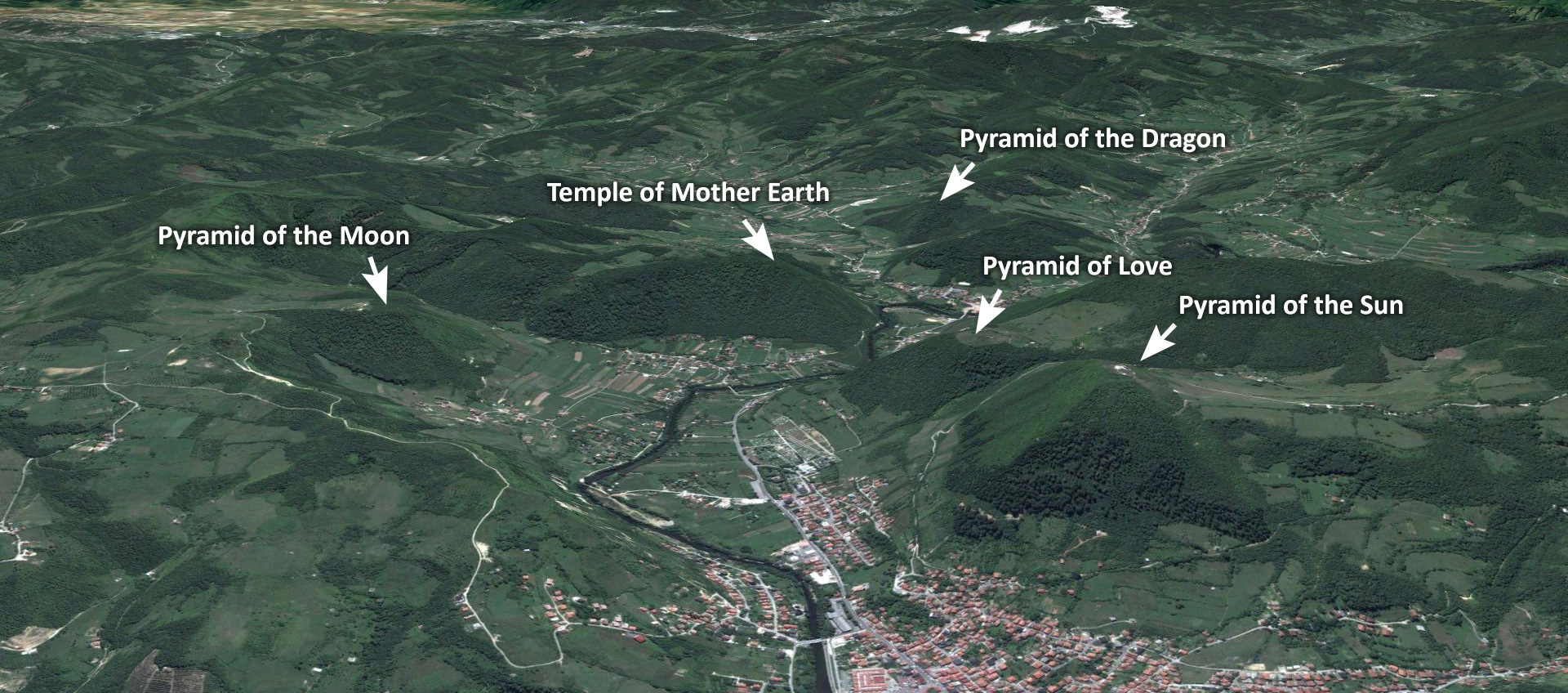 Thung lũng kim tự tháp ở thành phố Visoko, nằm ở trung tâm Bosnia và Herzegovina, xứng đáng là tổ hợp kim tự tháp lớn nhất thế giới được phát hiện từ trước đến nay. Tại đây có kim tự tháp Mặt Trời cao hơn 220m, kim tự tháp Mặt Trăng cao 190m (cao hơn đại kim tự tháp Giza ở Ai Cập với chiều cao 147m), kim tự tháp Rồng cao 90m, kim tự tháp thờ Mẹ Trái đất và kim tự tháp Tình yêu. Kim tự tháp Mặt Trời, kim tự tháp Mặt Trăng và kim tự tháp Rồng đều hình tam giác cân. Tất cả kim tự tháp đều xây hướng về phía Bắc.