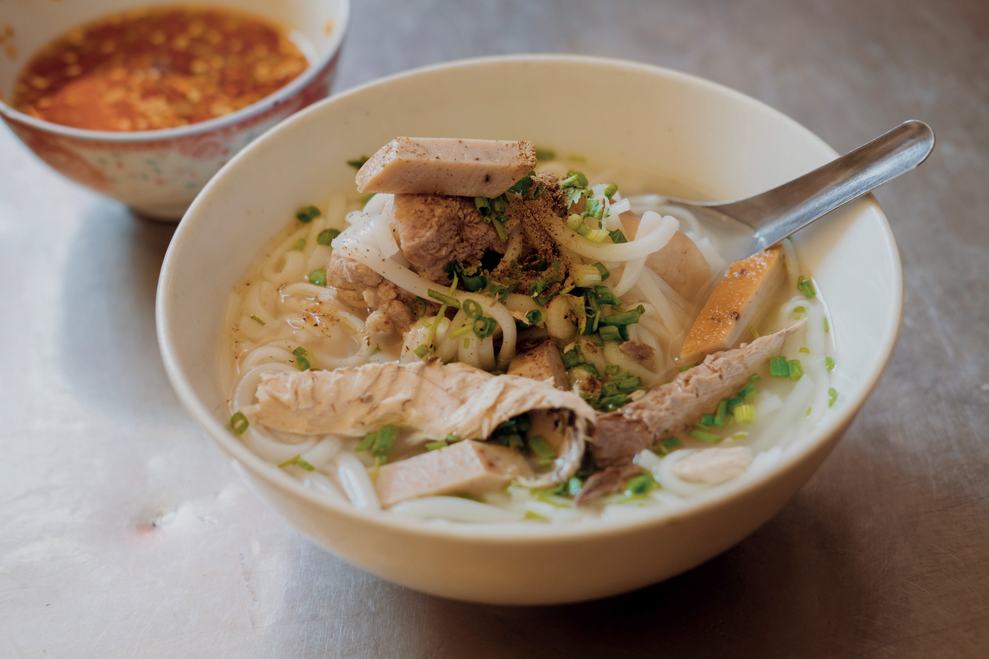 Bánh canh chả cá cũng là một món ăn nhất định bạn phải thử. Hàng bánh canh Nhường trên đường Ngô Gia Tự sáng sớm đã đông kín khách, chờ đến tận 20 phút phần ăn chúng tôi mới được mang ra. Tô bánh canh nóng hổi, nước lèo ngọt đậm đà được nấu từ xương heo và xương cá. Bánh canh ở đây làm từ 100% bột gạo, không pha bột năng, vừa mịn vừa dai, sợi bánh cũng vừa phải. Chả cá ngon tuyệt được làm hoàn toàn bằng thịt cá. Chủ quán đã phải dày công lóc xương, nạo thịt từng con cá tươi ngon nhất.