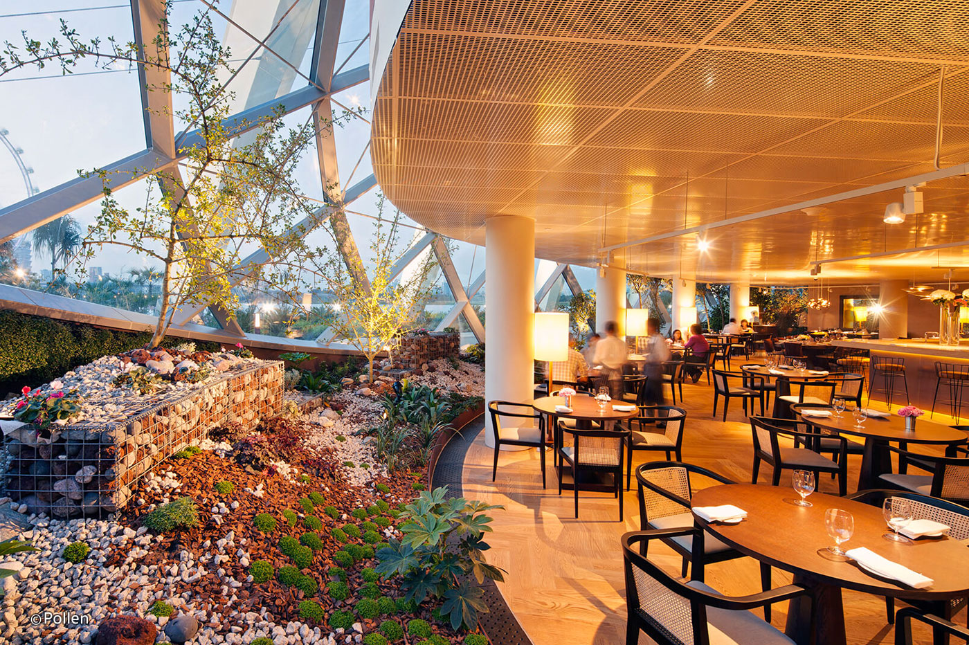Pollen là một trong những nhà hàng-quán cà phê có view ấn tượng nhất Singapore. Ngồi đây, bạn có thể nhìn thẳng ra vịnh Marina Bay, vị trí trung tâm đẹp nhất Singapore. Điểm đặc biệt thứ hai nằm ở không gian xanh bao phủ cả không gian.