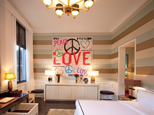 Nếu như phòng ngủ của chủ nhà với tông màu xanh ngọc tươi trẻ thì phòng ngủ dành cho khách nam có tường với giấy dán kẻ sọc ngang mạnh mẽ, và phòng ngủ khách nữ toát lên vẻ mềm mại với tường in hoa trên nền xanh hồ thủy. Tương tự như thế, đồ nội thất trong các phòng cũng mang dáng vẻ khác nhau, từ nét đĩnh đạc trang trọng với những bàn ghế mạ đồng và vàng trong phòng ngủ chủ nhân, đến đồ trang trí bằng da, ngà và sừng với đường nét vuông vắn chắc khỏe của phòng ngủ khách nam hay toàn bộ đồ gỗ màu đỏ nồng nàn với đường nét mềm mại kiểu Louis của phòng ngủ nữ, đều nói lên sự tinh tế và cẩn trọng trong việc phối hợp chúng vào không gian nội thất của chủ nhà.