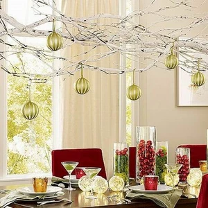Đèn chùm mang đậm màu sắc Giáng sinh sẽ giúp không gian bàn tiệc bừng sáng. Nếu đầu tư loại đèn chùm này quá tốn kém cho một mùa lễ hội duy nhất trong năm đối với bạn, bạn hoàn toàn có thể tự mày mò thiết kế riêng cho mình từ các chỉ dẫn trên mạng. Đơn giản mà lại hiệu quả nhất đó là một nhành cây khô được phủ sơn kim loại trắng và đính kèm những quả châu tròn. Thế là bạn đã có món đồ trang trí để treo trên trần vừa cá tính, lại kinh tế.