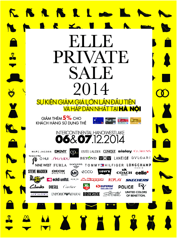 ELLE Private Sale 2014 được xem là sự kiện giảm giá lớn lần đầu tiên và hấp dẫn nhất mùa lễ hội tại Hà Nội do tạp chí thời trang hàng đầu – ELLE tổ chức, kết hợp với đối tác là các thương hiệu thời trang, mỹ phẩm cao cấp chính hãng. Chương trình quy tụ hơn 40 thương hiệu hàng đầu thế giới như: Marc Jacobs, Dkny, Cle De Peau Beauté, Estee Lauder, Clinique, Sisley, Clarins, Whoo, Ohui, Shiseido, Beyond, VOV, Laneige, Bvlgari, Nini West, Furla, Dockers, Tommy Hilfiger, Longchamp, Steve Madden, Geox, Michael Kors, Ecco, Levi’s, Coach, Celio, Dr Marterns, Ekco, Kappa, Replay, Skechers, Clarks, Diesel, Cartier, Tag Heuer, Superga, Police, David Yurman, Judith Leiber, Emporio Armani, Birkenstock, Silhouette,United Colors Of Benetton… với mức giảm giá lên đến 50%. Đặc biệt, giảm giá thêm 5% trong suốt 2 ngày diễn ra sự kiện dành riêng cho khách hàng sử dụng thẻ Classic, Gold, Platinum và Premier của HSBC.