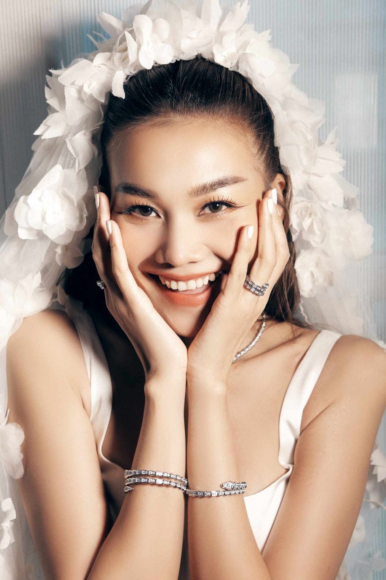 Điểm ấn tượng trong trang phục cưới của Thanh Hằng là những bộ trang sức đính kim cương. Được biết, cả 2 bộ trang sức được cô dâu lựa chọn đến từ BTS Fioever và Serpenti của thương hiệu hoàn kim xa xỉ – Bvlgari.