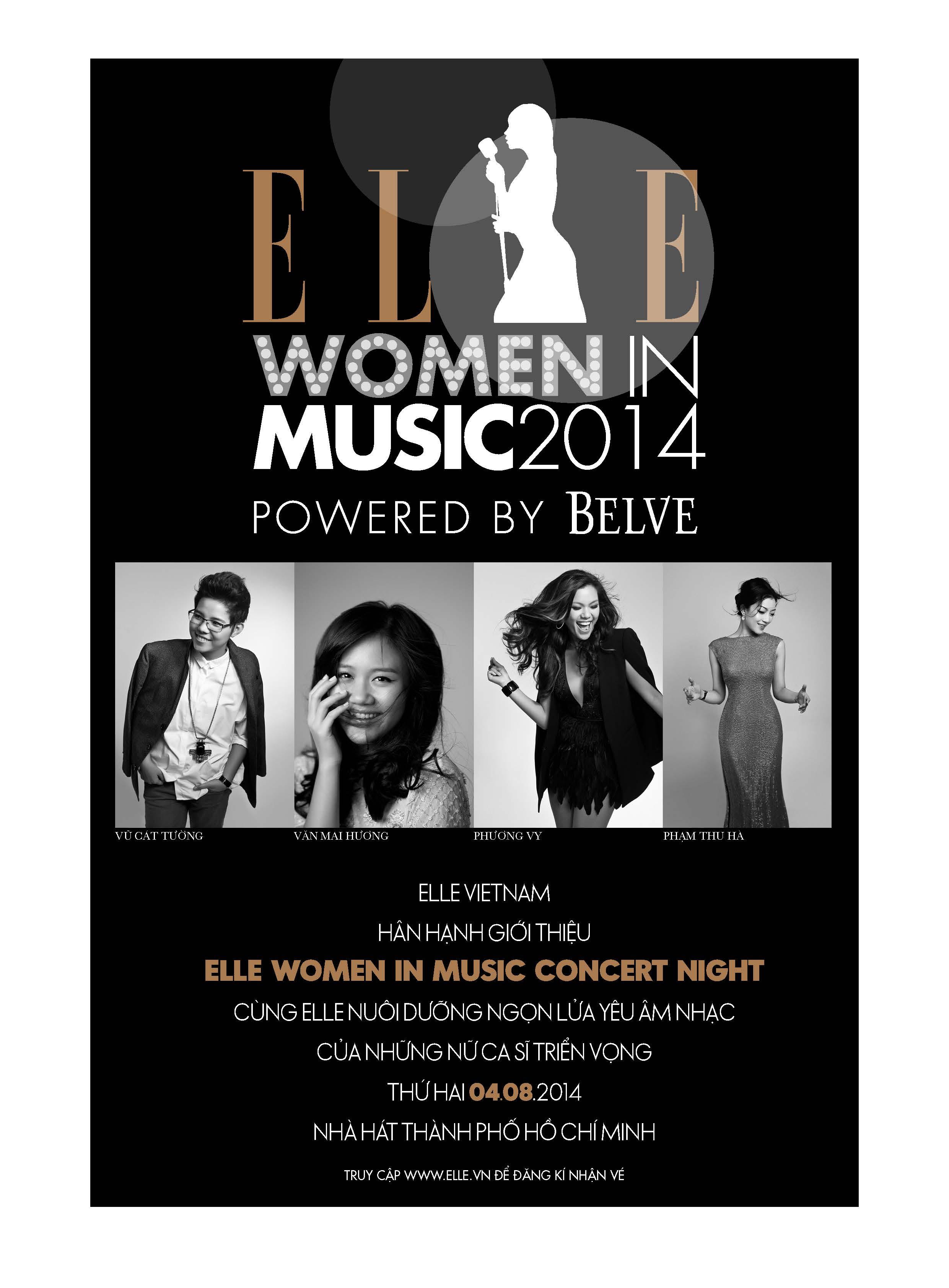 VẺ ĐẸP, GIỌNG HÁT của phụ nữ, những giai điệu họ viết ra đã trở thành nguồn CẢM HỨNG cho biết bao nhiêu khán giả, cũng như những nghệ sĩ khác. Hàng năm, tạp chí ELLE trên khắp thế giới đã tổ chức đêm nhạc thời trang ELLE – Women in Music để TÔN VINH những người phụ nữ đã góp phần tạo nên sự đa dạng của nền văn hóa âm nhạc ở quốc gia. Năm nay, ELLE – Women in music LẦN ĐẦU TIÊN được tổ chức tại Việt Nam, giới thiệu những giọng ca nữ góp phần tạo nên vẻ đẹp đa dạng của âm nhạc Việt: Vũ Cát Tường, Phạm Thu Hà, Văn Mai Hương và Phương Vy. Chương trình sẽ diễn ra vào ngày 4/8/2014 tại Nhà hát lớn, Thành phố Hồ Chí Minh.