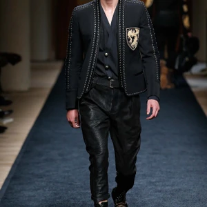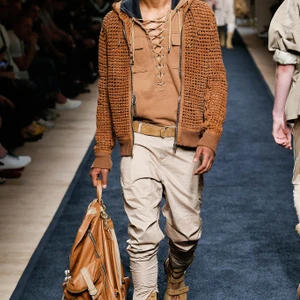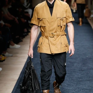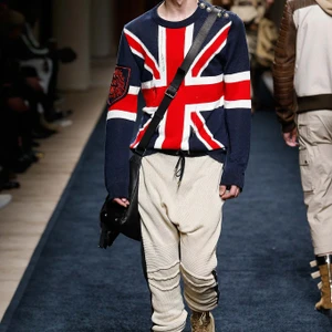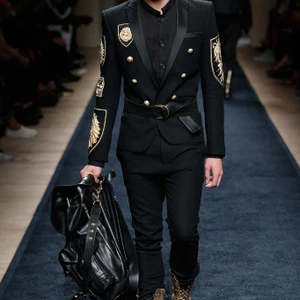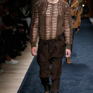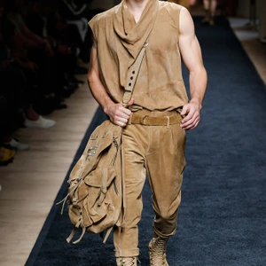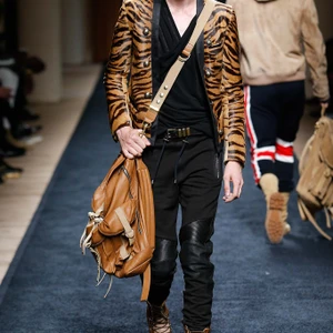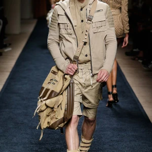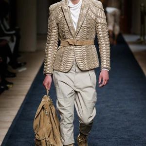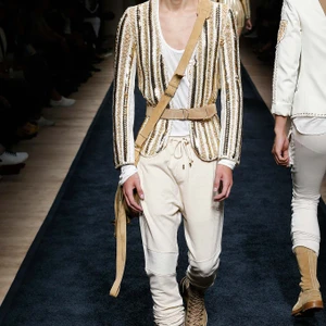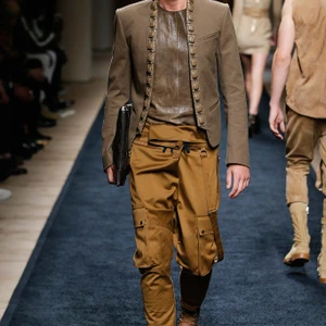 Ở bộ sưu tập cho nam đầu tiên của mình, Rousteing chọn chủ đề Safari cho sàn catwalk nhưng điều này không có nghĩa “chỉ có kaki”. Không có những bước đi dò dẫm, Balmain ghi dấu ấn sâu đậm bằng sự phong phú trong sáng tạo. Những đôi ủng sa mạc được chuyển biến hóa thành đôi giày lạ mắt, hở mũi và thông thoáng với đường khoét cao, nối với nhau bằng dây đan độc đáo. Những chiếc quần lính bụi bặm được nâng cấp với đáy quần thấp, chất liệu thun vô cùng thoải mái cùng những chiếc áo khoác quân sự đầy mới mẻ với những sợi đay bện bắt mắt.