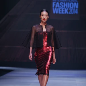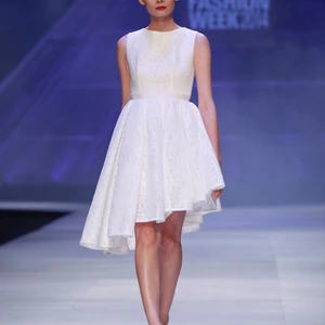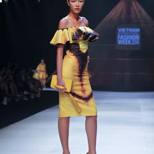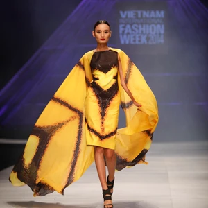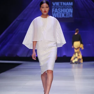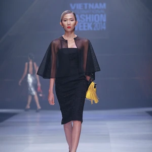 Chất liệu kim sa và lưới được sử dụng với liều lượng nhỏ, là điểm nhấn cho một số kiểu đầm đơn giản. Những đường diềm đánh bèo khổ lớn ở chân váy và tay áo dài rũ điệu đàng là những chi tiết làm sáng tổng thể và tăng thêm phần nữ tính cho bộ sưu tập.