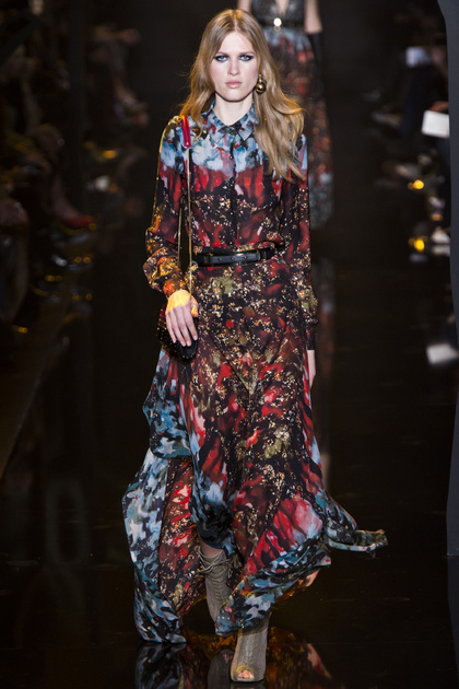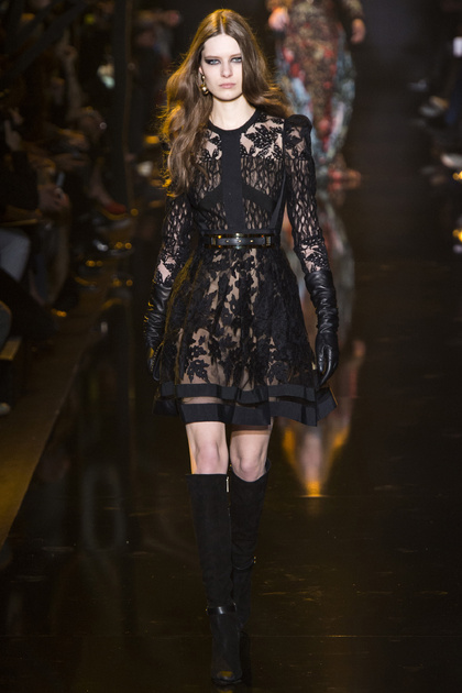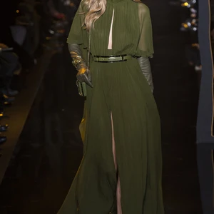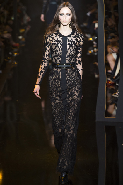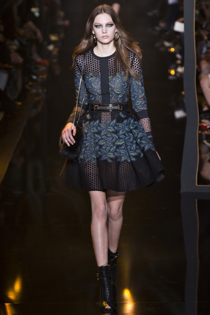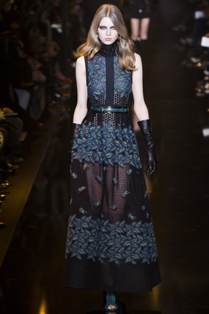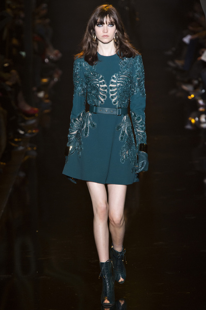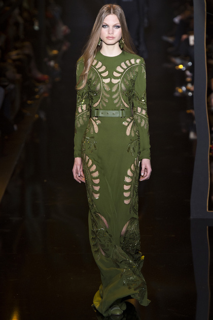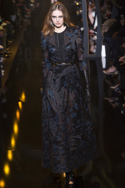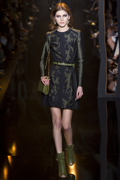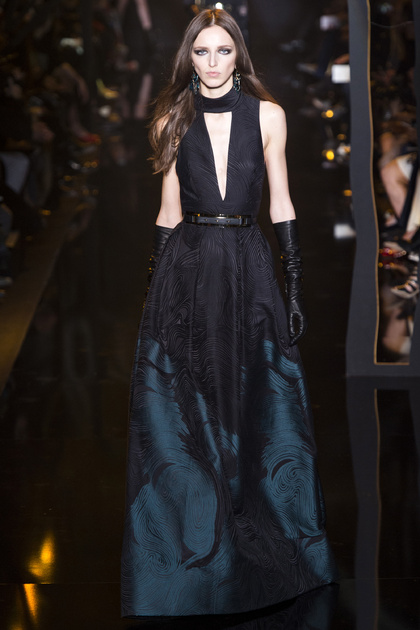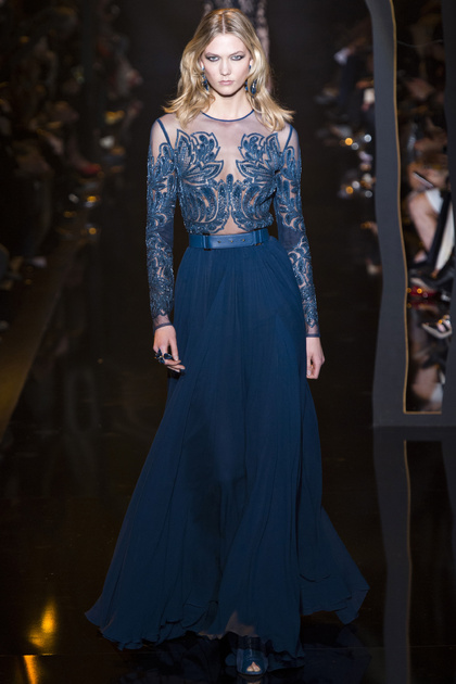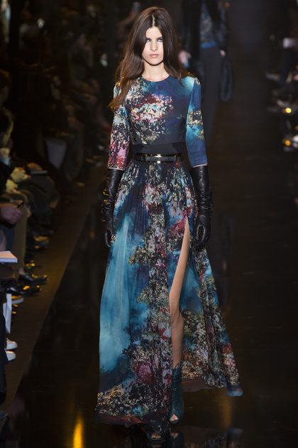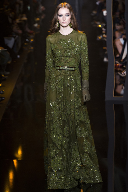 “The way of the woods – Lối vào rừng sâu” là tên gọi của BST này. Những chiếc cúc bóng lộn được đính khéo léo trên áo khoác hay dải thắt lưng cứng cáp quấn gọn gàng ở phần eo tạo nên ấn tượng mạnh về quyền lực. Những họa tiết ren cộng với đường hoa văn kết nối nhau quanh cánh tay, cổ áo và liền xuống chân váy như những cây dây leo đang ôm lấy cơ thể để bảo vệ nữ hoàng của mình. Màu xanh đậm sâu thẳm không còn mơ mộng như cách mà Elie Saab tô vẽ cho những bộ váy trước kia của mình mà thay vào đó là sự điềm tĩnh, trưởng thành trong những bước đi khoan thai của người mẫu trên sàn diễn. Phụ kiện đặc biệt của BST này là những chiếc găng tay, làm bật sự sang trọng và bí ấn.