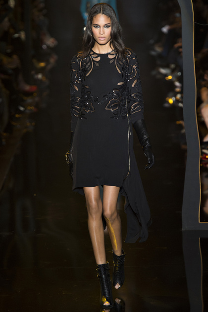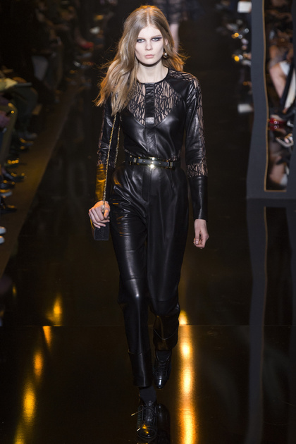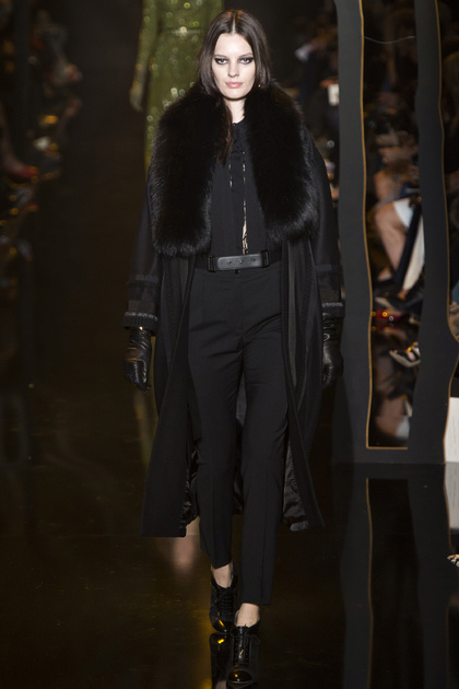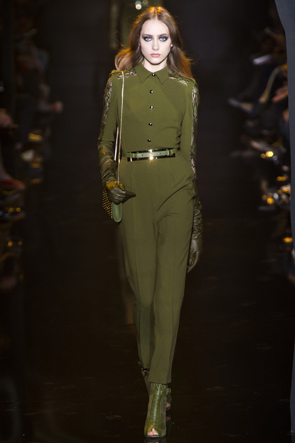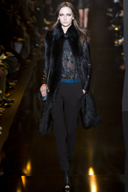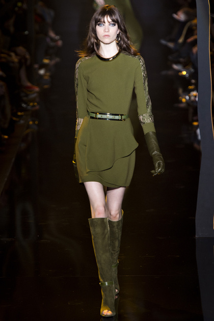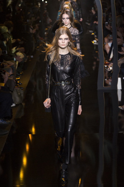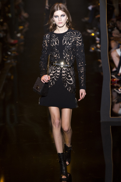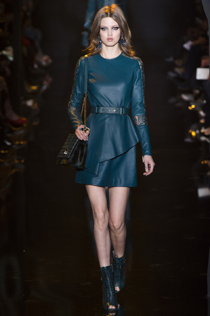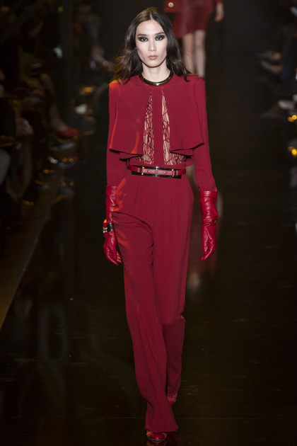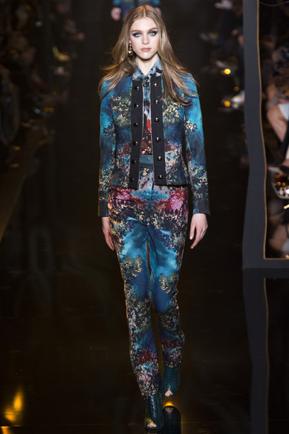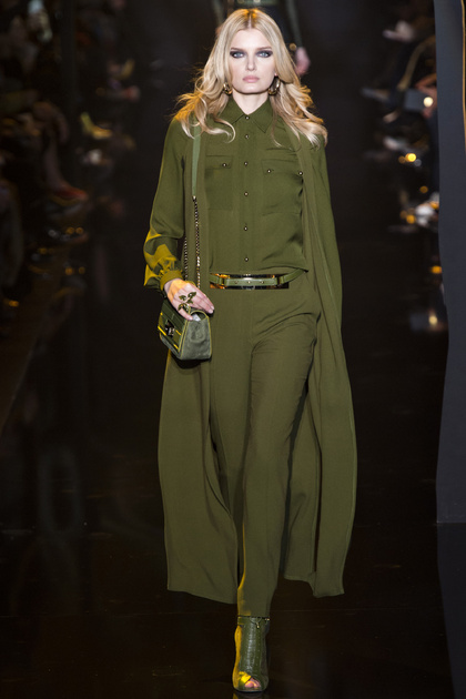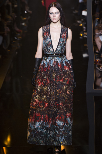 “The way of the woods – Lối vào rừng sâu” là tên gọi của BST này. Những chiếc cúc bóng lộn được đính khéo léo trên áo khoác hay dải thắt lưng cứng cáp quấn gọn gàng ở phần eo tạo nên ấn tượng mạnh về quyền lực. Những họa tiết ren cộng với đường hoa văn kết nối nhau quanh cánh tay, cổ áo và liền xuống chân váy như những cây dây leo đang ôm lấy cơ thể để bảo vệ nữ hoàng của mình. Màu xanh đậm sâu thẳm không còn mơ mộng như cách mà Elie Saab tô vẽ cho những bộ váy trước kia của mình mà thay vào đó là sự điềm tĩnh, trưởng thành trong những bước đi khoan thai của người mẫu trên sàn diễn. Phụ kiện đặc biệt của BST này là những chiếc găng tay, làm bật sự sang trọng và bí ấn.