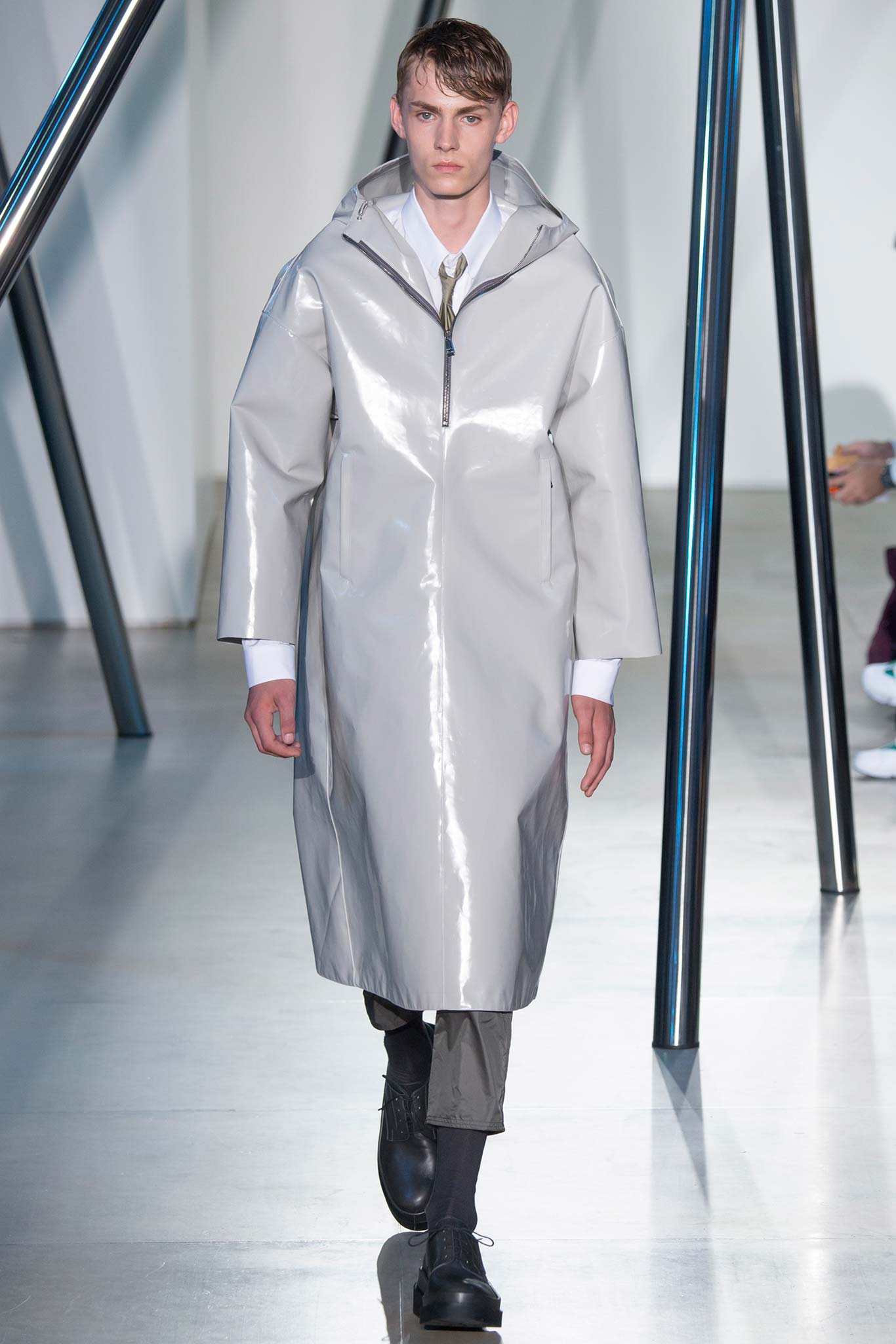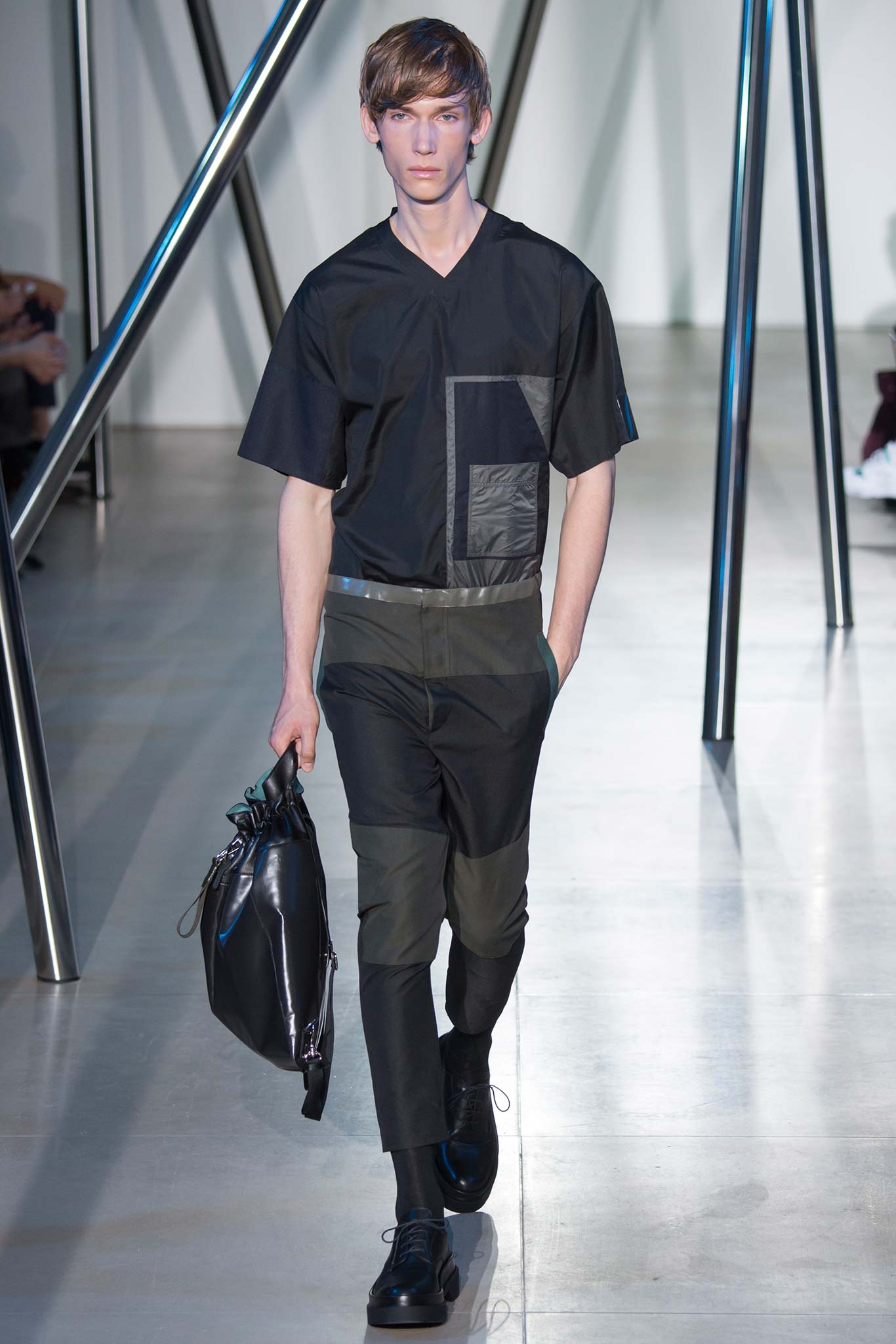 Sự tiện dụng dễ dàng nhận thấy ở mọi thiết kế. Những chiếc túi, dây đai đắp nổi khác màu tạo hiệu ứng hình hộp đẹp mắt. Bên đó, chất liệu bóng, mỏng và nhẹ còn đem đến cảm giác như những chiếc áo khoác vừa được lấy vội từ trong xe, phóng khoáng và bụi bặm. Chất nylon còn được thể hiện qua cả những chiếc áo vest, quần cắt trên mắt cá hoặc trên gối, màu sắc đơn giản như xám trắng, đen. Tổng thể khiến người nhìn ấn tượng với vẻ chỉn chu nhưng cảm giác vội vã, phóng khoáng lại xuất hiện khi chiếc cà vạt được thắt lệch. Ngoài ra, những chiếc túi canvas da bóng, túi hộp lạ mắt cũng là điểm nhất khó quên.