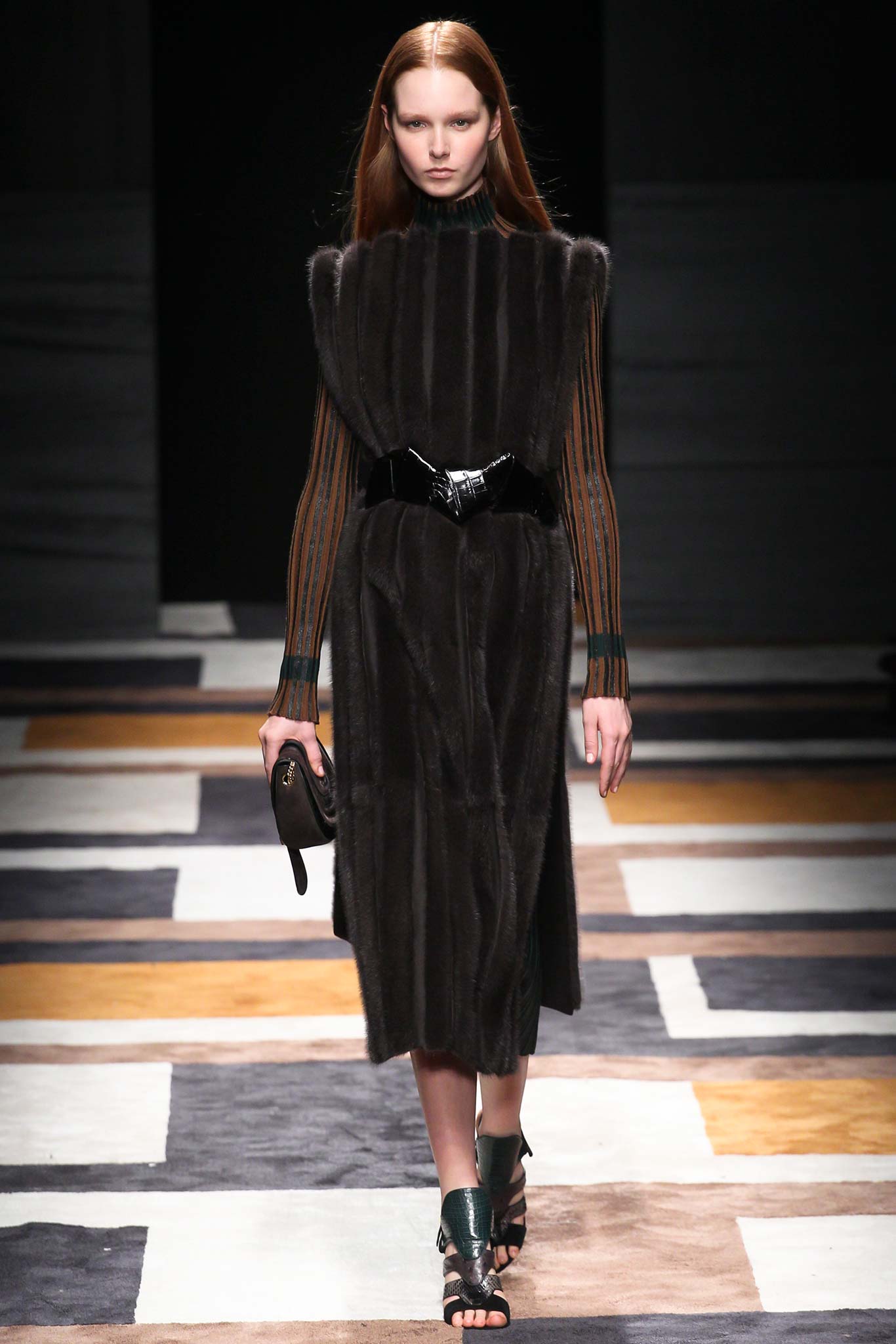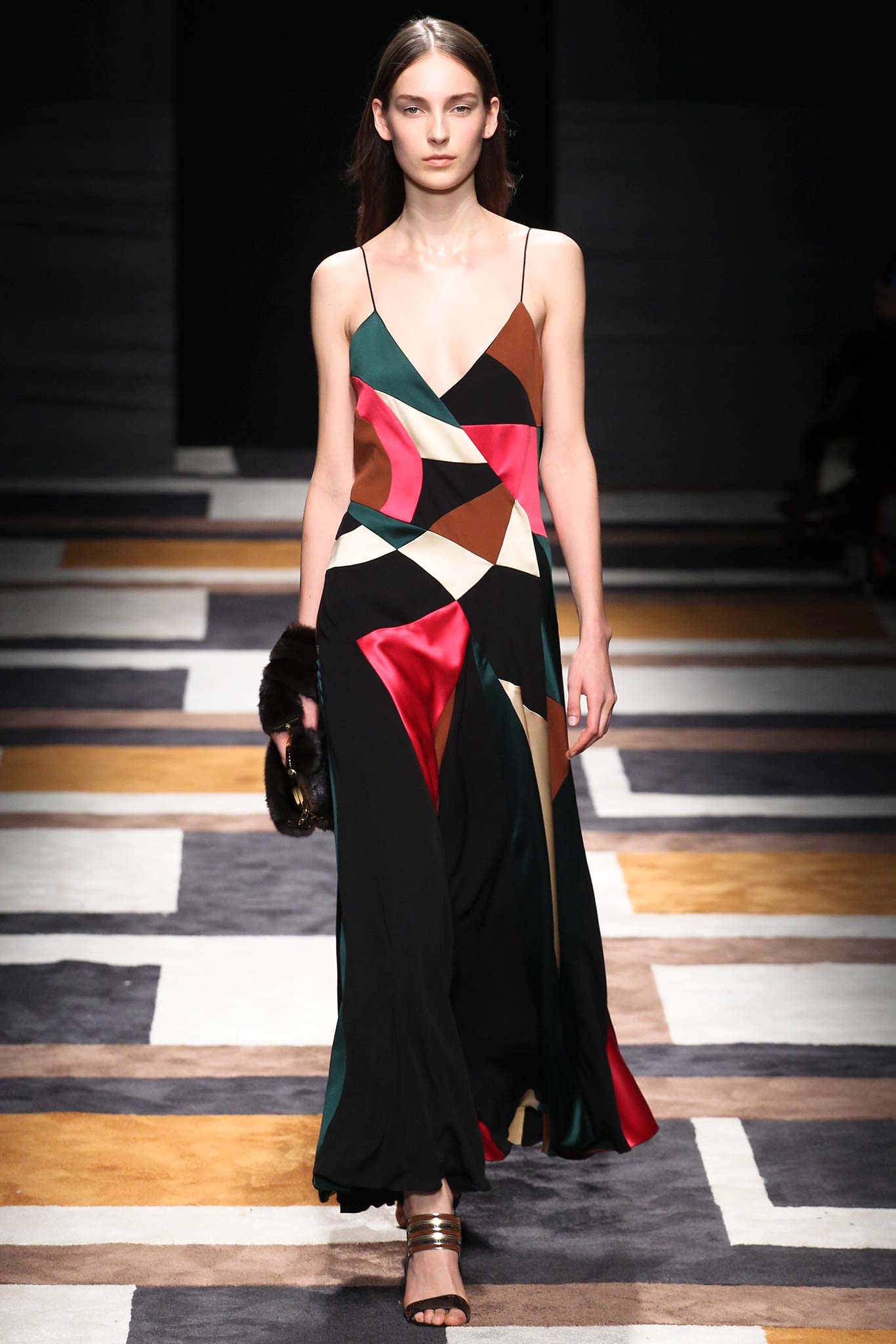 Thu-Đông năm nay, Giornetti đã luôn suy nghĩ về vẻ đẹp mạnh mẽ của các đường vẽ đồ họa, ông thể hiện chúng trong bộ sưu tập của mình, với motif chính là những mảng màu color-block. Trong khi những chiếc váy trim dành cho ban ngày được chia thành các mảng màu hình chữ nhật có trật tự thì chiếc váy buổi tối lại được biến tấu với những mảng màu được cắt xẻ và chắp vá bất đối xứng, làm nổi bật vòng eo nhỏ nhắn của người phụ nữ. Áo khoác và váy tuyệt đối tối giản với hình dáng suôn, phẳng, như một mảnh vải quấn quanh cơ thể, được tô điểm bởi hàng cúc bản lớn ở bên hông. Chỉ với vài điểm nhấn đơn giản, những thiết kế của nhà mốt danh tiếng vẫn đem lại nét lịch lãm, sang trọng cần thiết.