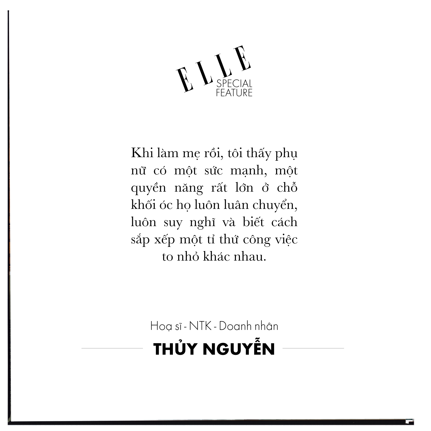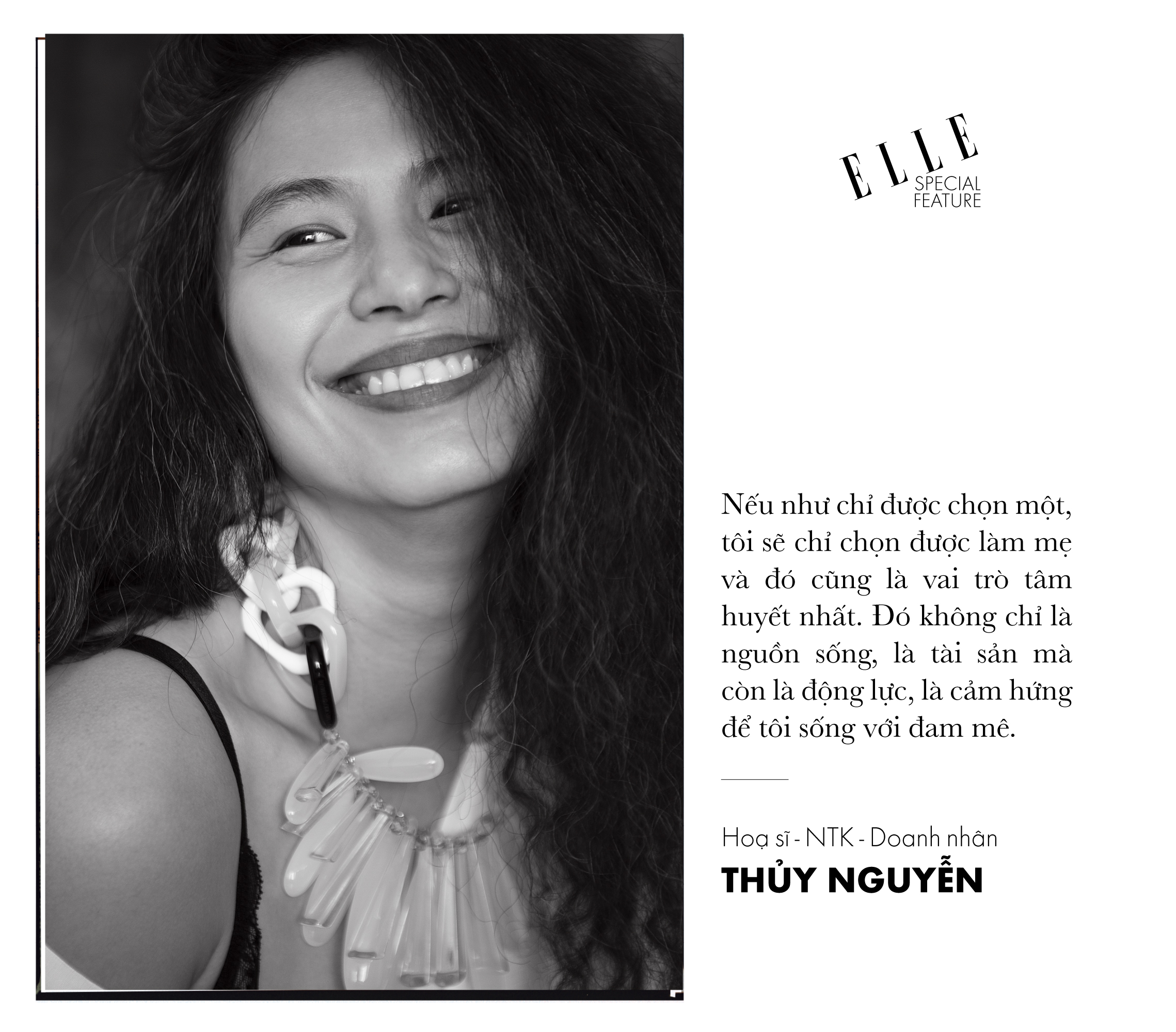 Nếu như chỉ được chọn một, tôi sẽ chỉ chọn được làm mẹ và đó cũng là vai trò tâm huyết nhất. Đó không chỉ là nguồn sống, là tài sản mà còn là động lực, là cảm hứng để tôi sống với đam mê. Mỗi ngày, các bạn ấy về và kể cho tôi nghe về thế giới ngoài kia, về những gì thế hệ con cháu mình đang nghĩ hay đang theo trào lưu nào để tôi cập nhật và học hỏi. Đó cũng là lý do tôi muốn phát triển nghệ thuật đương đại, vì tôi luôn muốn đóng góp vào một xã hội mà mình mong những đứa trẻ của mình sẽ được trưởng thành.