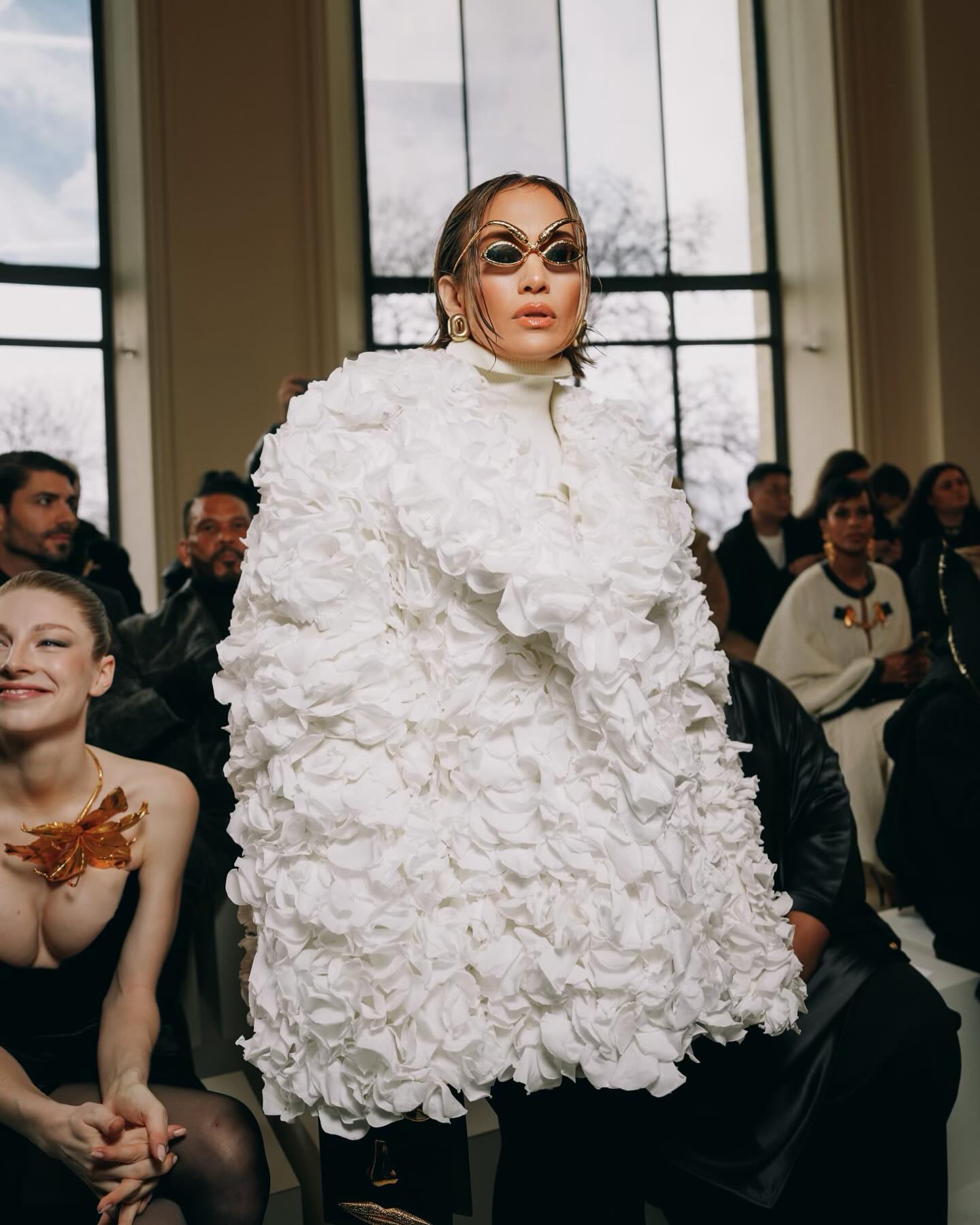 Jennifer Lopez xuất hiện vô cùng quyền lực trong trang phục gồm áo khoác trắng được đính bởi hàng trăm cánh hoa vải, quần legging kết hợp cùng phụ kiện siêu thực đặc trưng của Schiaparelli. Được biết, đây là bộ trang phục được NTK Daniel Roseberry thiết kế riêng cho cô nàng. Khoảnh khắc nữ ca sĩ bước tới đã chiếm trọn spotlight trước thềm buổi diễn.