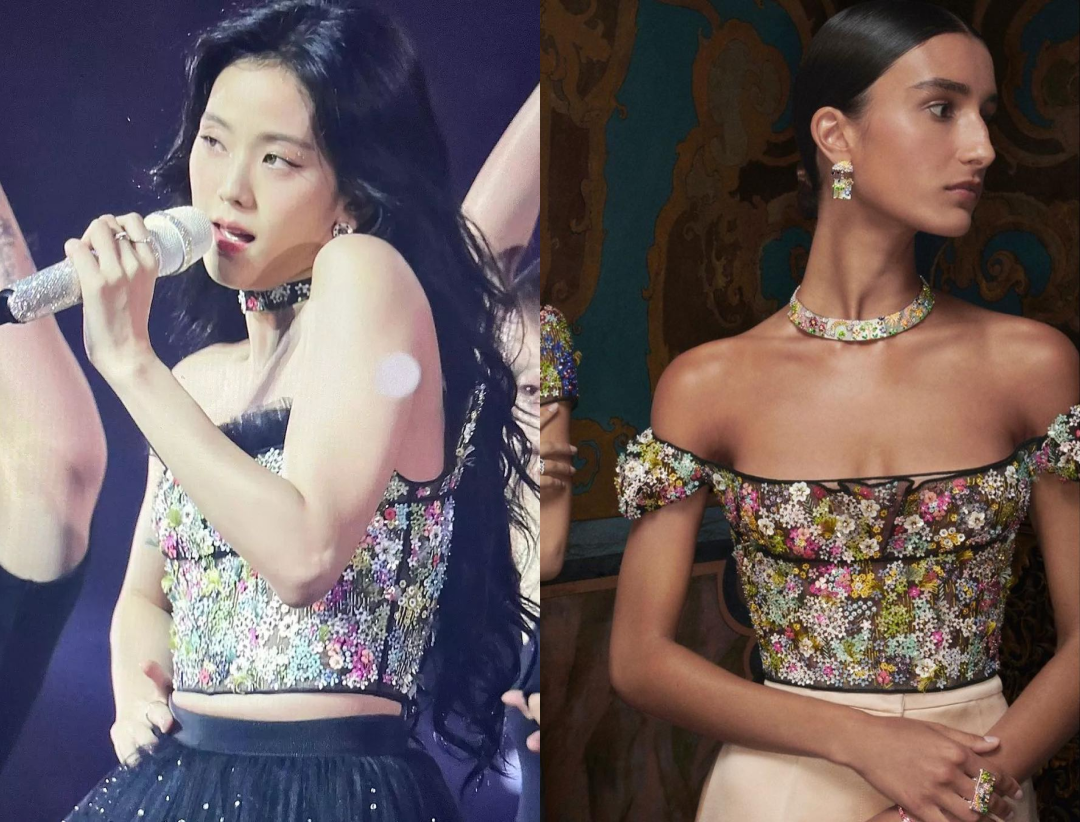 Là cô gái có màn trình diễn solo thứ 2, Jennie không khiến người hâm mộ thất vọng với màn trình diễn của mình ở cả hai buổi diễn. Ở đêm diễn thứ nhất, “ái nữ” nhà Chanel hoá thân thiếu nữ Trung Đông trong bộ trang phục đỏ rực lấp lánh, phối với phần mũ hood mang đến sự quyến rũ theo phong cách balletcore. Thiết kế có giá 1.234 euro (khoảng 30 triệu đồng), được đặt may riêng từ thương hiệu nước Ý – Giuseppe Di Morabito. Để hoàn thiện set đồ, stylist của Jennie còn khéo léo đính thêm hai chiếc ghim cài áo để tạo thành mẫu áo hai dây gợi cảm. Tổng “thiệt hại” cho 2 chiếc cài áo này là 2.600 euro (khoảng 63 triệu đồng).