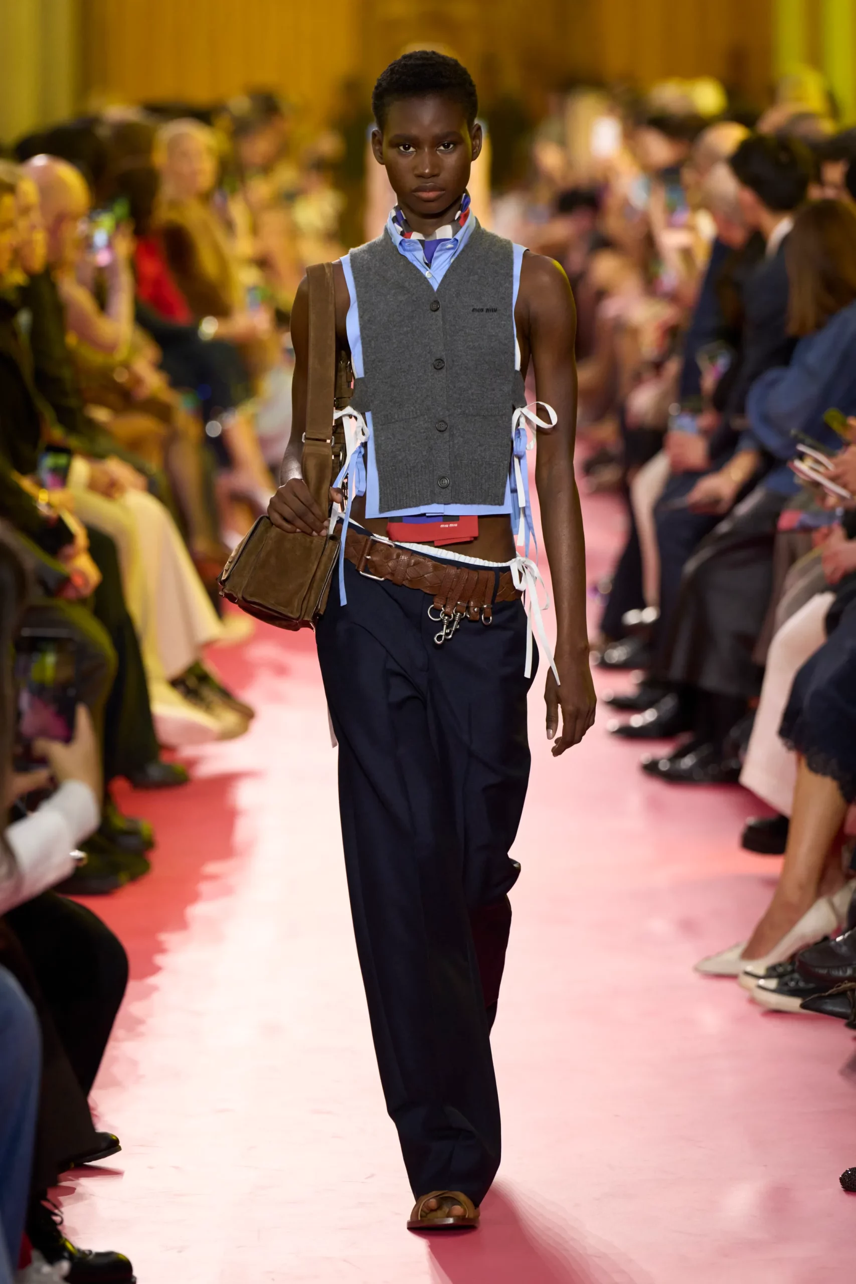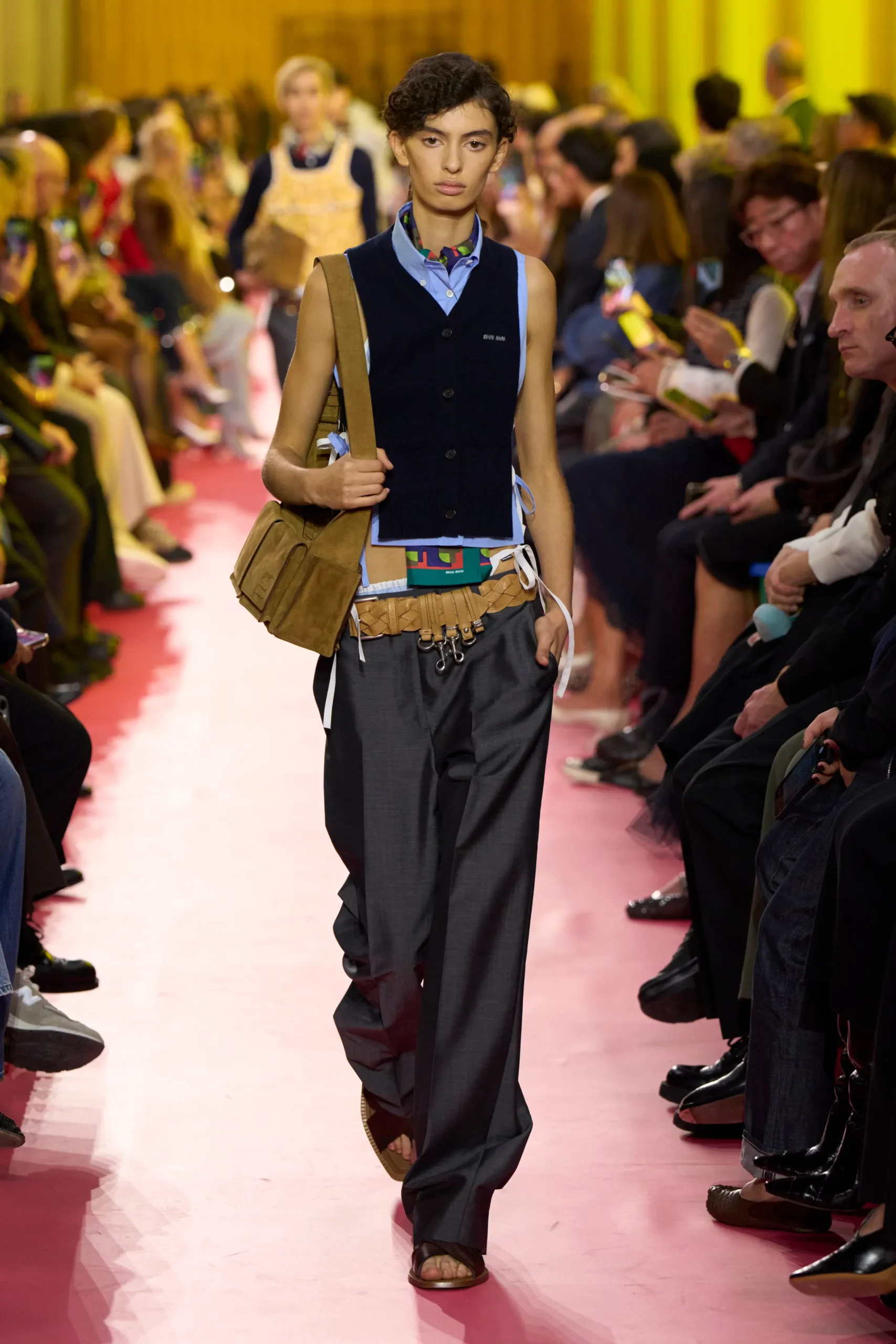 Về chất liệu và lối phối, các thiết kế ưu tiên sự thoải mái của da lộn, denim và vải dệt kim mỏng. Các chi tiết họa tiết hoa, ren pastel và tông màu retro được kết hợp tinh tế, vừa thể hiện sự mềm mại, vừa nhấn mạnh sự mạnh mẽ bên trong. Kỹ thuật layering là điểm nhấn quan trọng, kết hợp trang phục với vòng cổ hạt cườm, khăn quàng cổ họa tiết graphic và giày da nam tính, tạo ra phong cách vừa thực tế, vừa độc đáo đậm chất Miu Miu.